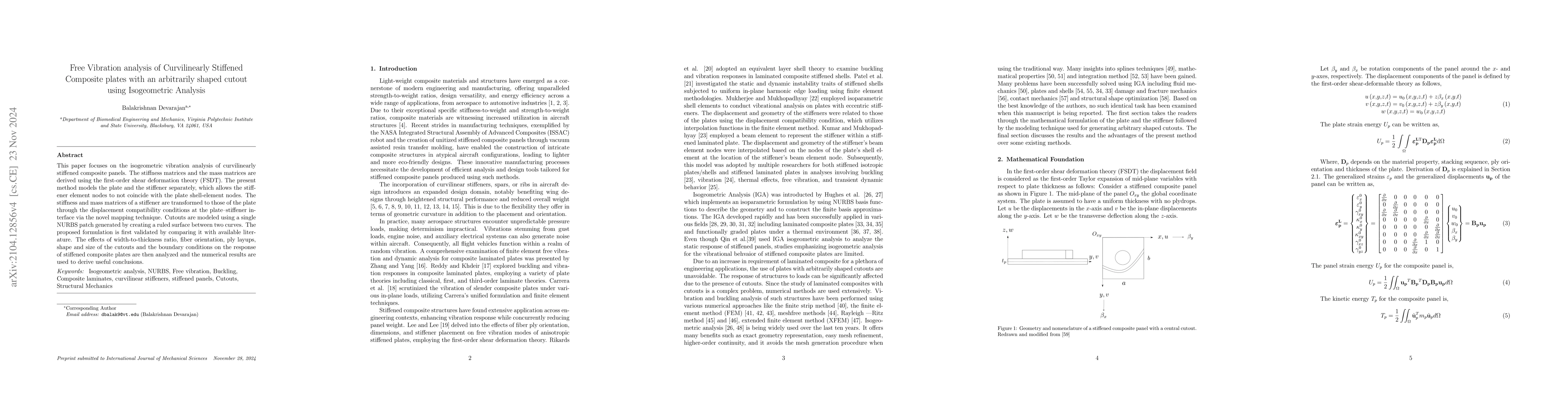 This paper uses isogeometric analysis to study the free vibration of curvilinearly stiffened composite plates with arbitrarily shaped cutouts, employing FSDT and NURBS basis functions for modeling. The study validates the proposed method against existing literature and analyzes the impact of various parameters on plate response.