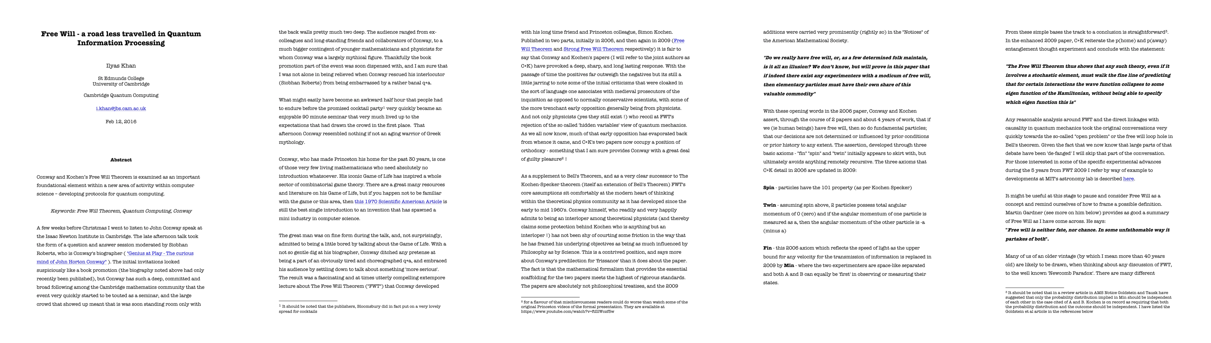 Conway and Kochen's Free Will Theory is examined as an important foundational element in a new area of activity in computer science - developing protocols for quantum computing