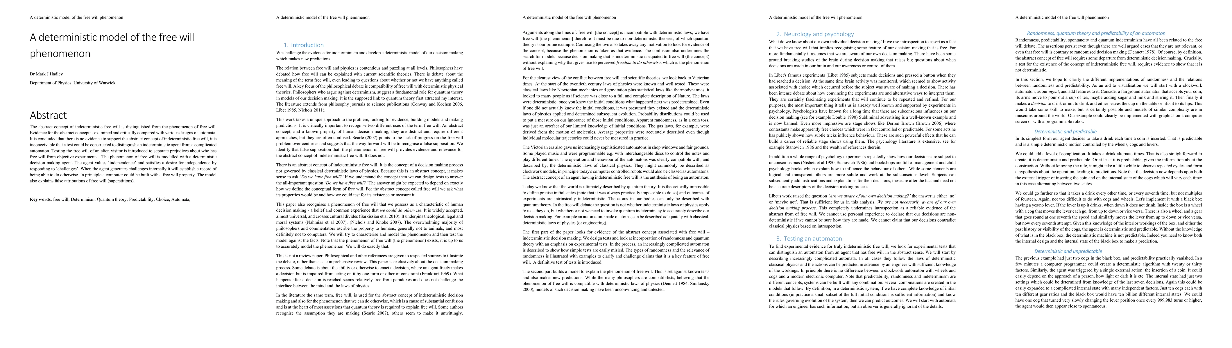 This paper argues that the abstract concept of indeterministic free will lacks empirical support and cannot be distinguished from complex automata. It proposes a deterministic model of free will as a phenomenon, where an agent values independence and responds to challenges, potentially allowing for a computer with a free will property.