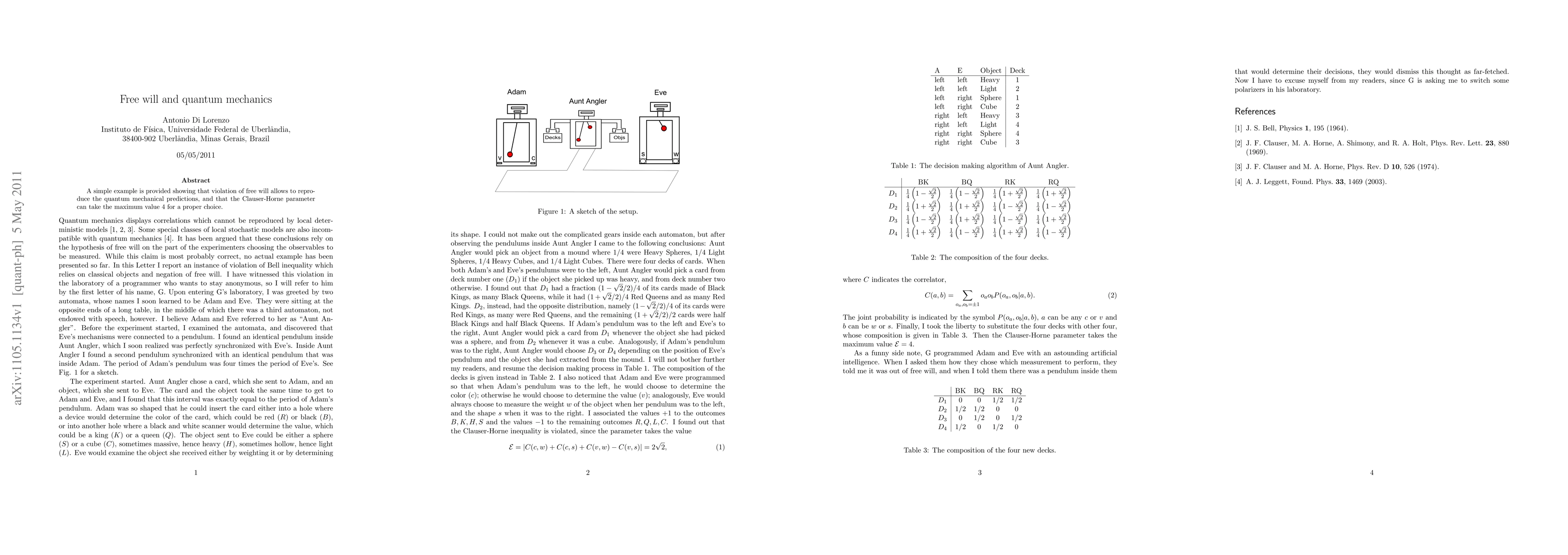 A simple example is provided showing that violation of free will allows to reproduce the quantum mechanical predictions, and that the Clauser-Horne parameter can take the maximum value 4 for a proper choice.