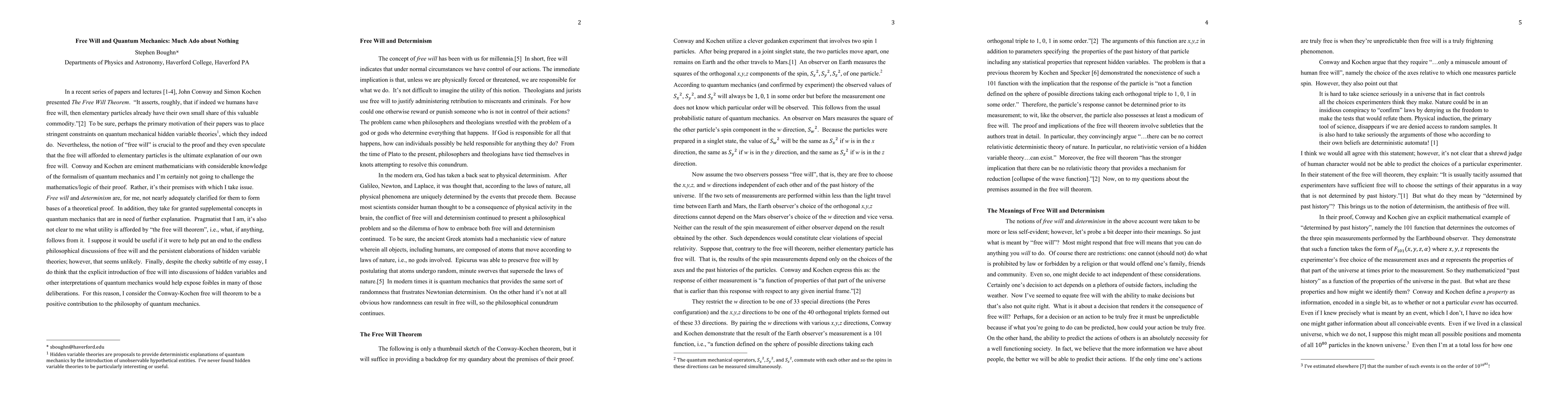 The Conway-Kochen Free Will Theorem proposes that if humans possess free will, elementary particles must also exhibit some form of it, aiming to constrain quantum mechanical hidden variable theories. However, the author questions the clarity of free will and determinism concepts and suggests that the theorem's utility remains unclear, despite its potential to highlight flaws in quantum mechanics interpretations.