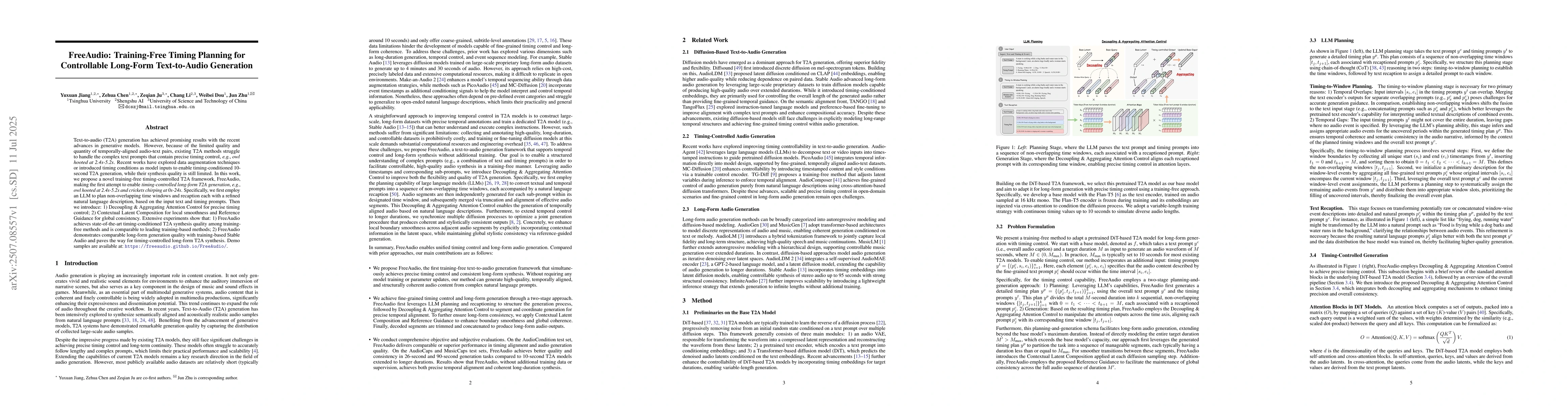 Text-to-audio (T2A) generation has achieved promising results with the recent advances in generative models. However, because of the limited quality and quantity of temporally-aligned audio-text pairs, existing T2A methods struggle to handle the complex text prompts that contain precise timing control, e.g., "owl hooted at 2.4s-5.2s". Recent works have explored data augmentation techniques or introduced timing conditions as model inputs to enable timing-conditioned 10-second T2A generation, while their synthesis quality is still limited. In this work, we propose a novel training-free timing-controlled T2A framework, FreeAudio, making the first attempt to enable timing-controlled long-form T2A generation, e.g., "owl hooted at 2.4s-5.2s and crickets chirping at 0s-24s". Specifically, we first employ an LLM to plan non-overlapping time windows and recaption each with a refined natural language description, based on the input text and timing prompts. Then we introduce: 1) Decoupling and Aggregating Attention Control for precise timing control; 2) Contextual Latent Composition for local smoothness and Reference Guidance for global consistency. Extensive experiments show that: 1) FreeAudio achieves state-of-the-art timing-conditioned T2A synthesis quality among training-free methods and is comparable to leading training-based methods; 2) FreeAudio demonstrates comparable long-form generation quality with training-based Stable Audio and paves the way for timing-controlled long-form T2A synthesis. Demo samples are available at: https://freeaudio.github.io/FreeAudio/