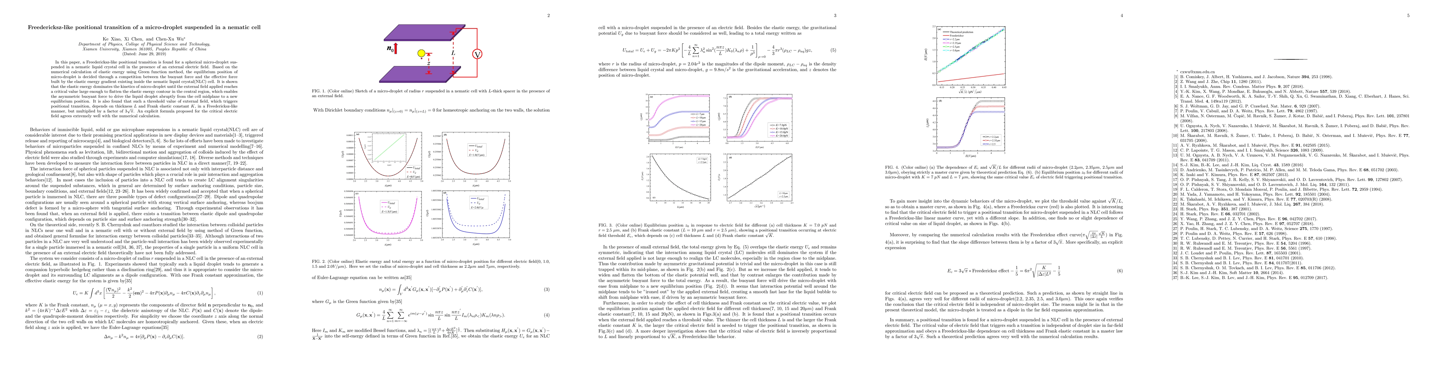 This research identifies a Freedericksz-like positional transition of a micro-droplet in a nematic liquid crystal cell under an external electric field. The study uses numerical calculations of elastic energy via the Green function method to determine the droplet's equilibrium position, balancing buoyant force with the elastic energy gradient. A critical electric field value, triggering the positional transition, is found to depend on the cell thickness and Frank elastic constant, with an explicit formula aligning well with numerical results.