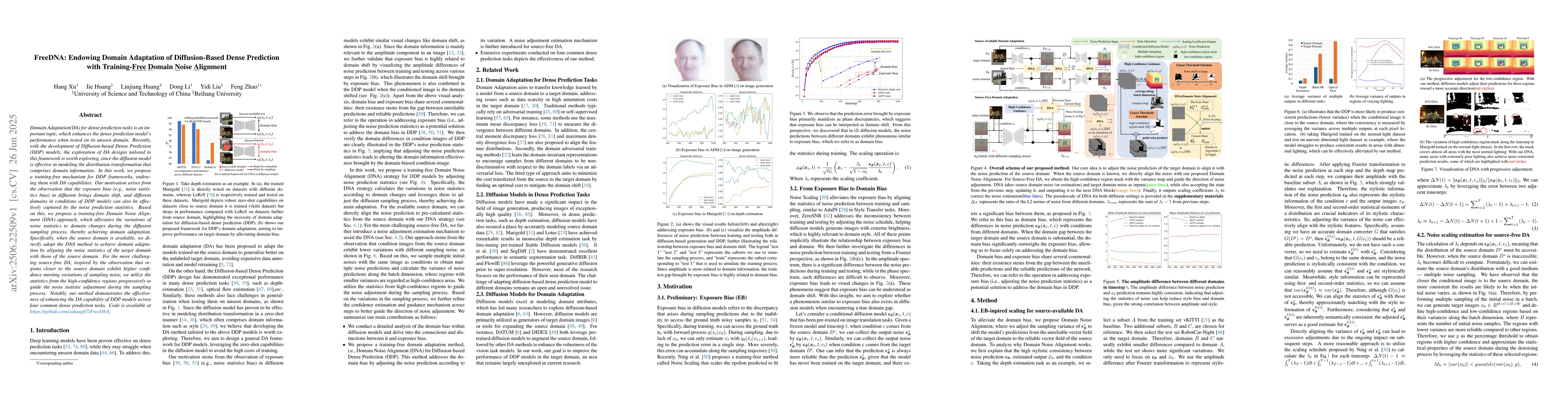 Domain Adaptation(DA) for dense prediction tasks is an important topic, which enhances the dense prediction model's performance when tested on its unseen domain. Recently, with the development of Diffusion-based Dense Prediction (DDP) models, the exploration of DA designs tailored to this framework is worth exploring, since the diffusion model is effective in modeling the distribution transformation that comprises domain information. In this work, we propose a training-free mechanism for DDP frameworks, endowing them with DA capabilities. Our motivation arises from the observation that the exposure bias (e.g., noise statistics bias) in diffusion brings domain shift, and different domains in conditions of DDP models can also be effectively captured by the noise prediction statistics. Based on this, we propose a training-free Domain Noise Alignment (DNA) approach, which alleviates the variations of noise statistics to domain changes during the diffusion sampling process, thereby achieving domain adaptation. Specifically, when the source domain is available, we directly adopt the DNA method to achieve domain adaptation by aligning the noise statistics of the target domain with those of the source domain. For the more challenging source-free DA, inspired by the observation that regions closer to the source domain exhibit higher confidence meeting variations of sampling noise, we utilize the statistics from the high-confidence regions progressively to guide the noise statistic adjustment during the sampling process. Notably, our method demonstrates the effectiveness of enhancing the DA capability of DDP models across four common dense prediction tasks. Code is available at \href{https://github.com/xuhang07/FreeDNA}{https://github.com/xuhang07/FreeDNA}.