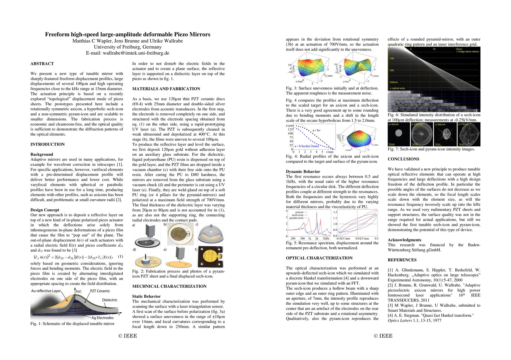 We present a new type of tunable mirror with sharply-featured freeform displacement profiles, large displacements of several 100\mu m and high operating frequencies close to the kHz range at 15mm diameter. The actuation principle is based on a recently explored "topological" displacement mode of piezo sheets. The prototypes presented here include a rotationally symmetric axicon, a hyperbolic sech-icon and a non-symmetric pyram-icon and are scalable to smaller dimensions. The fabrication process is economic and cleanroom-free, and the optical quality is sufficient to demonstrate the diffraction patterns of the optical elements.