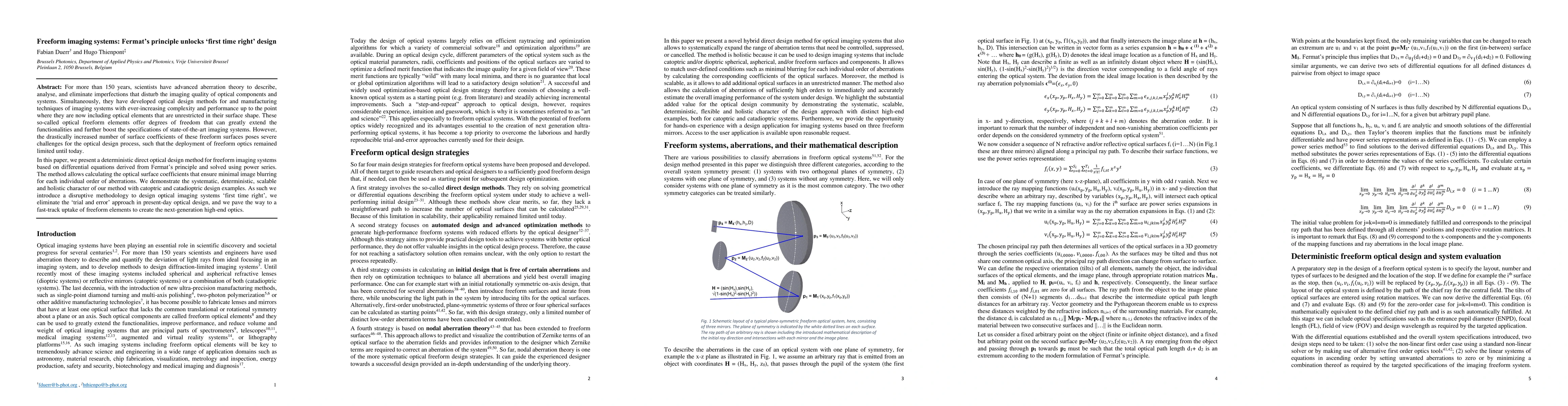 This paper introduces a novel deterministic design method for freeform imaging systems based on Fermat's principle, enabling the calculation of optical surface coefficients to minimize image blurring. The method eliminates the need for trial and error, paving the way for the widespread adoption of freeform optics in next-generation high-end imaging systems.