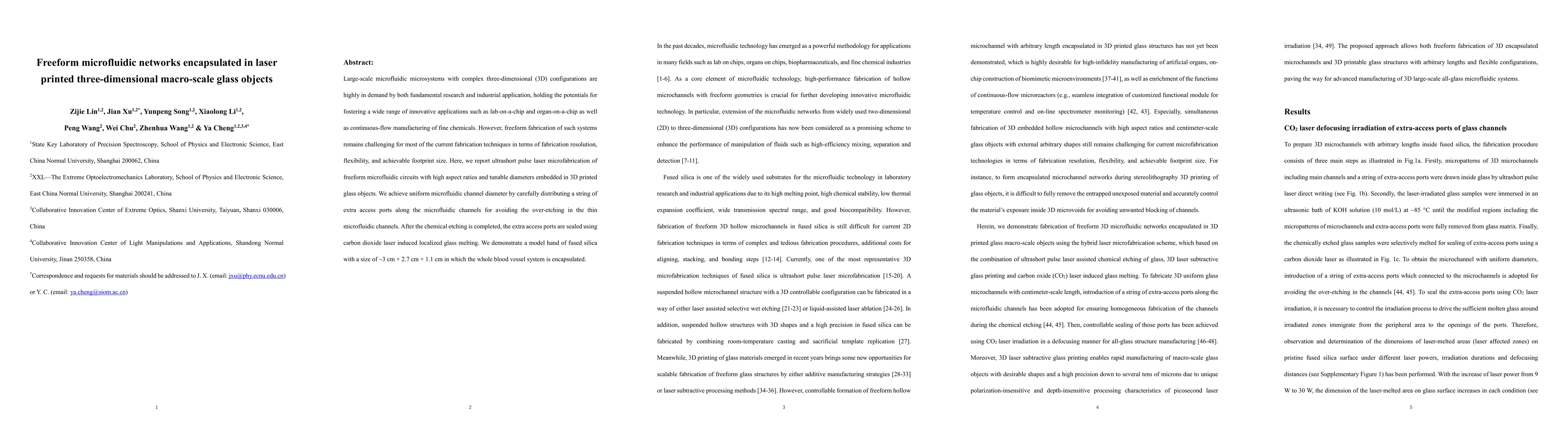 This paper presents a method for creating complex, freeform microfluidic networks using ultrashort pulse laser microfabrication within 3D printed glass objects, achieving high resolution and uniform channel diameters. The technique involves embedding the microfluidic circuits in a fused silica hand model, demonstrating the potential for lab-on-a-chip and continuous-flow manufacturing applications.
