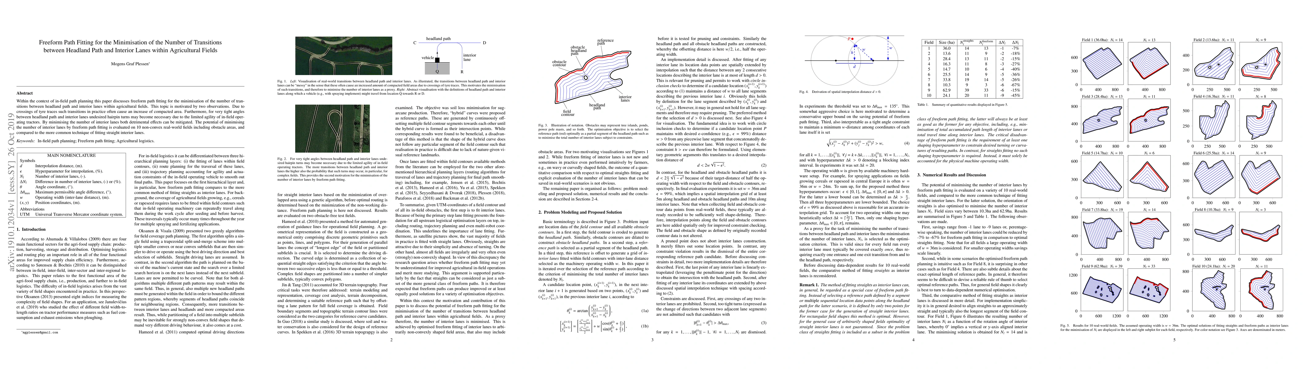 Within the context of in-field path planning this paper discusses freeform path fitting for the minimisation of the number of transitions between headland path and interior lanes within agricultural fields. This topic is motivated by two observations. Due to crossings of tyre traces such transitions in practice often cause an increase of compacted area. Furthermore, for very tight angles between headland path and interior lanes undesired hairpin turns may become necessary due to the limited agility of in-field operating tractors. By minimising the number of interior lanes both detrimental effects can be mitigated. The potential of minimising the number of interior lanes by freeform path fitting is evaluated on 10 non-convex real-world fields including obstacle areas, and compared to the more common technique of fitting straight interior lanes.