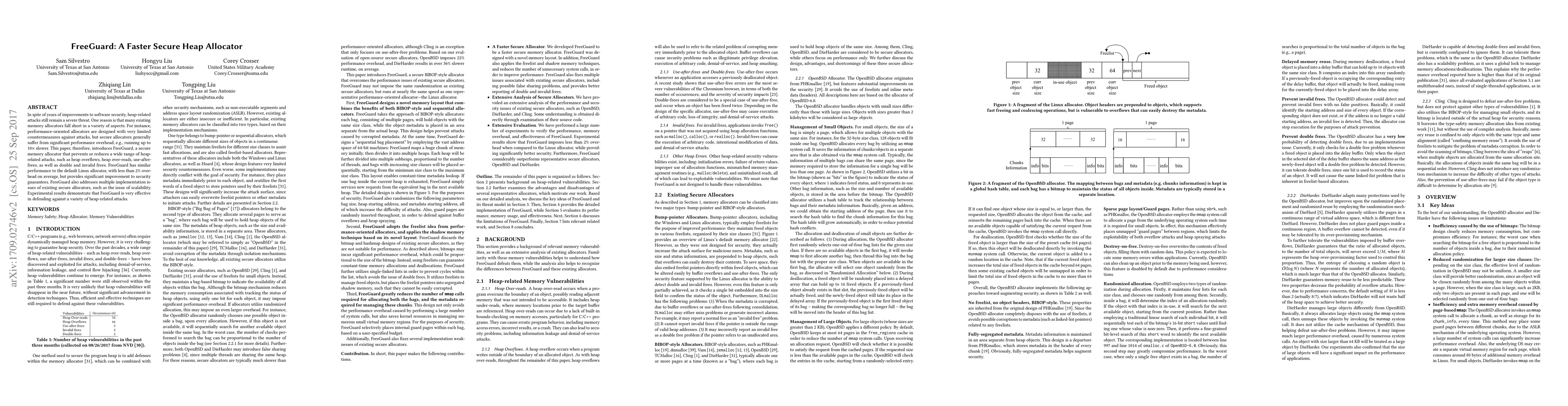 FreeGuard is a novel secure memory allocator that effectively mitigates a wide range of heap-related attacks while maintaining near-optimal performance, with less than 2% overhead compared to the default Linux allocator. Experimental results show FreeGuard's efficacy in defending against various threats, addressing scalability issues of existing secure allocators.