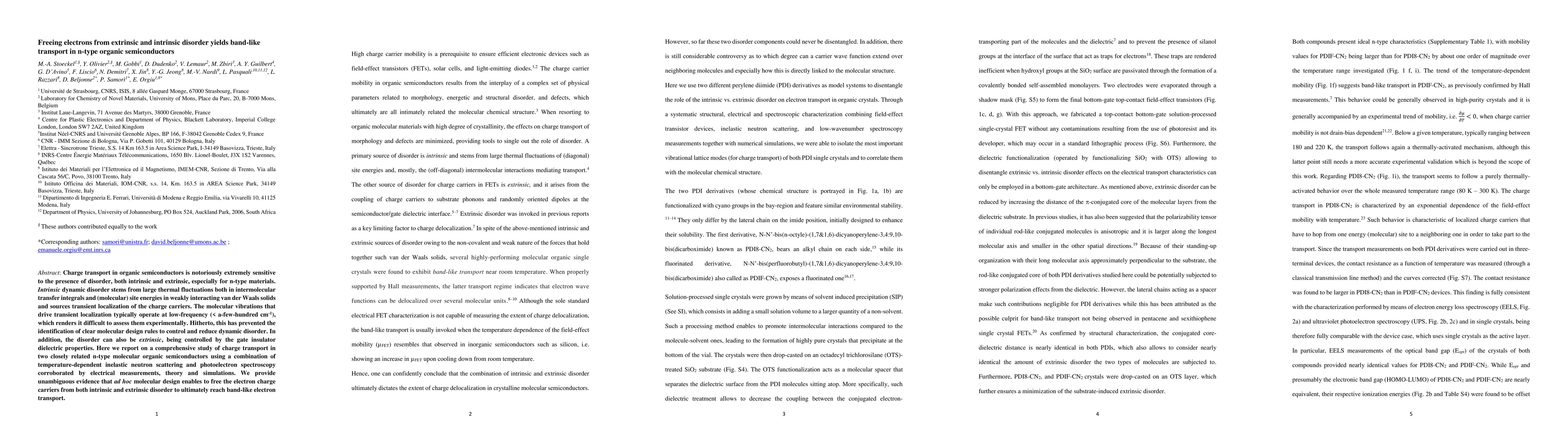 This paper investigates how molecular design can mitigate intrinsic and extrinsic disorder in n-type organic semiconductors, leading to enhanced band-like charge transport. Through advanced experimental and theoretical methods, the authors demonstrate that strategic molecular engineering can liberate electrons from disorder, achieving improved charge mobility.