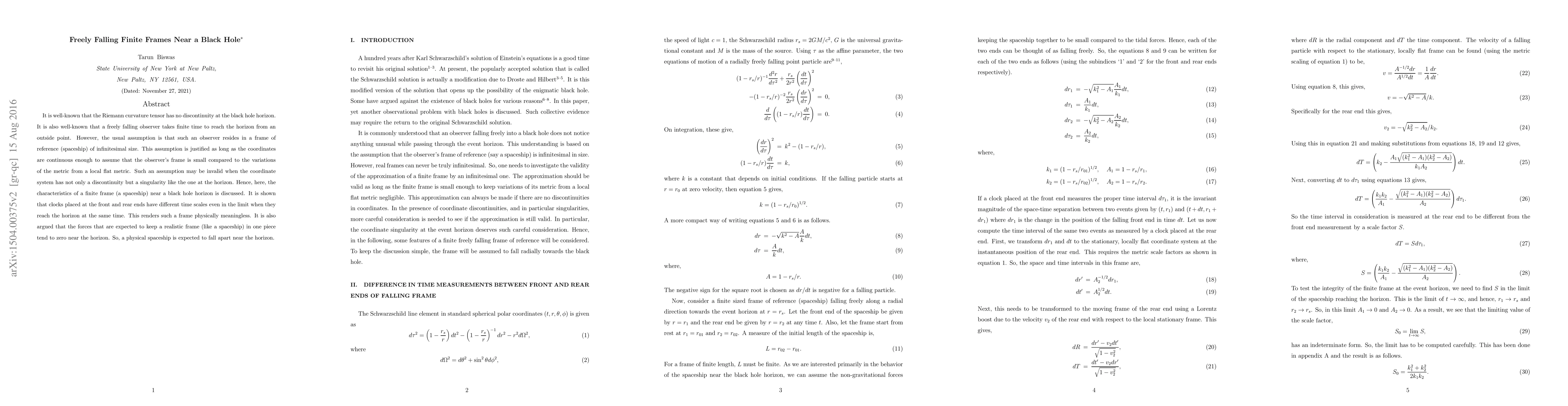 It is well-known that the Riemann curvature tensor has no discontinuity at the black hole horizon. It is also well-known that a freely falling observer takes finite time to reach the horizon from an outside point. However, the usual assumption is that such an observer resides in a frame of reference (spaceship) of infinitesimal size. This assumption is justified as long as the coordinates are continuous enough to assume that the observer's frame is small compared to the variations of the metric from a local flat metric. Such an assumption may be invalid when the coordinate system has not only a discontinuity but a singularity like the one at the horizon. Hence, here, the characteristics of a finite frame (a spaceship) near a black hole horizon is discussed. It is shown that clocks placed at the front and rear ends have different time scales even in the limit when they reach the horizon at the same time. This renders such a frame physically meaningless. It is also argued that the forces that are expected to keep a realistic frame (like a spaceship) in one piece tend to zero near the horizon. So, a physical spaceship is expected to fall apart near the horizon.