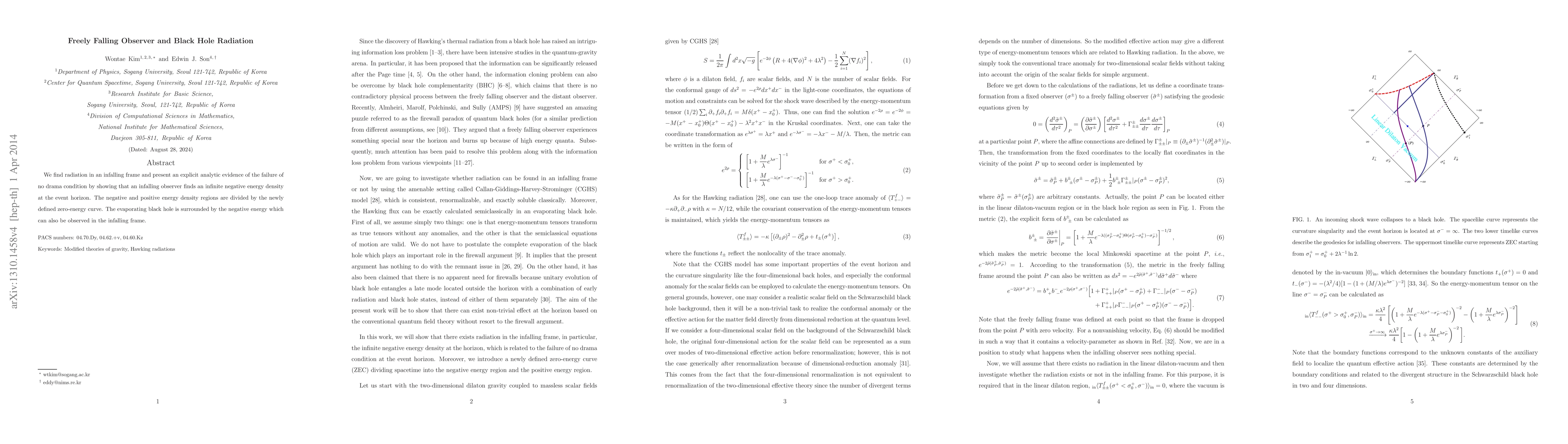 We find radiation in an infalling frame and present an explicit analytic evidence of the failure of no drama condition by showing that an infalling observer finds an infinite negative energy density at the event horizon. The negative and positive energy density regions are divided by the newly defined zero-energy curve. The evaporating black hole is surrounded by the negative energy which can also be observed in the infalling frame.