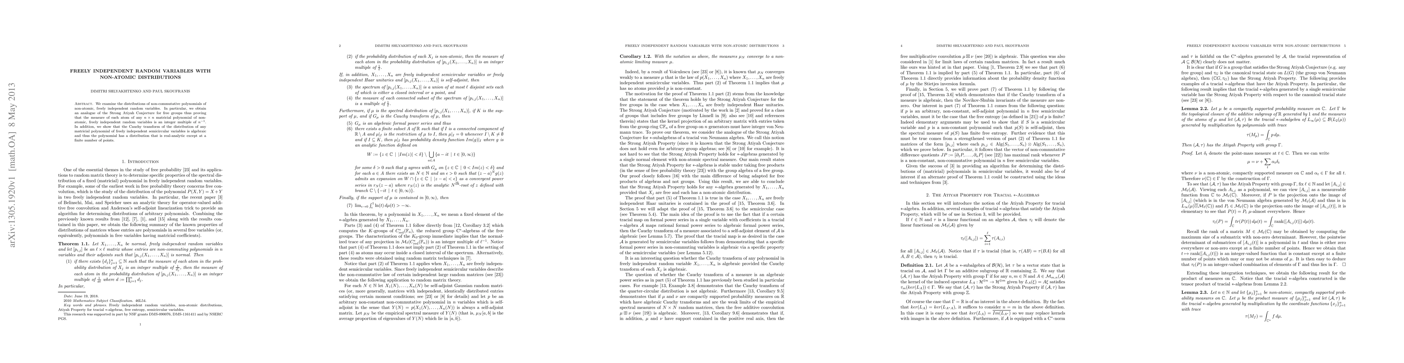 We examine the distributions of non-commutative polynomials of non-atomic, freely independent random variables. In particular, we obtain an analogue of the Strong Atiyah Conjecture for free groups thus proving that the measure of each atom of any $n \times n$ matricial polynomial of non-atomic, freely independent random variables is an integer multiple of $n^{-1}$. In addition, we show that the Cauchy transform of the distribution of any matricial polynomial of freely independent semicircular variables is algebraic and thus the polynomial has a distribution that is real-analytic except at a finite number of points.