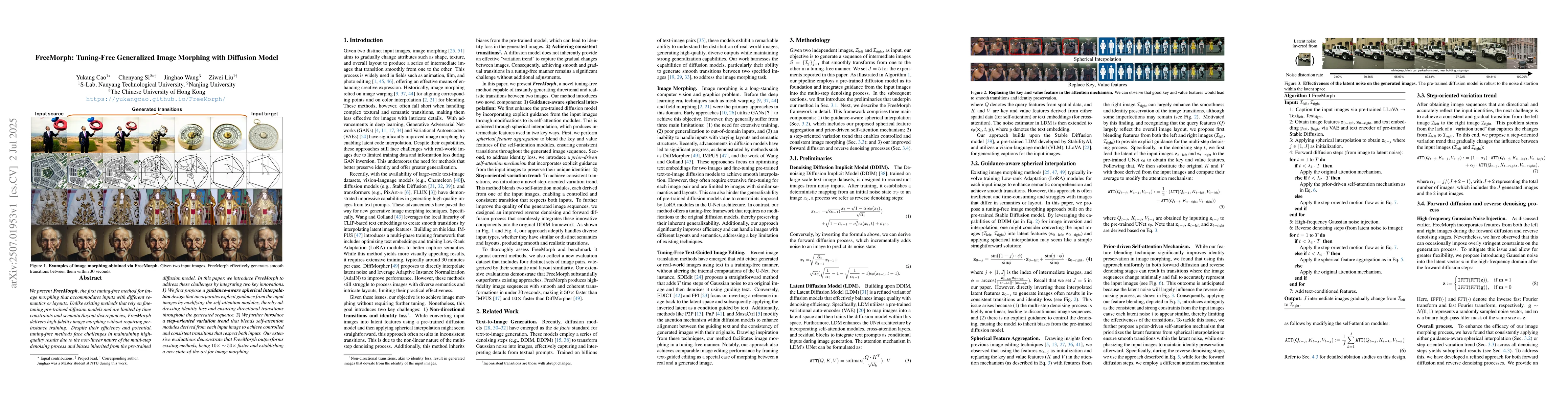 We present FreeMorph, the first tuning-free method for image morphing that accommodates inputs with different semantics or layouts. Unlike existing methods that rely on finetuning pre-trained diffusion models and are limited by time constraints and semantic/layout discrepancies, FreeMorph delivers high-fidelity image morphing without requiring per-instance training. Despite their efficiency and potential, tuning-free methods face challenges in maintaining high-quality results due to the non-linear nature of the multi-step denoising process and biases inherited from the pre-trained diffusion model. In this paper, we introduce FreeMorph to address these challenges by integrating two key innovations. 1) We first propose a guidance-aware spherical interpolation design that incorporates explicit guidance from the input images by modifying the self-attention modules, thereby addressing identity loss and ensuring directional transitions throughout the generated sequence. 2) We further introduce a step-oriented variation trend that blends self-attention modules derived from each input image to achieve controlled and consistent transitions that respect both inputs. Our extensive evaluations demonstrate that FreeMorph outperforms existing methods, being 10x ~ 50x faster and establishing a new state-of-the-art for image morphing.