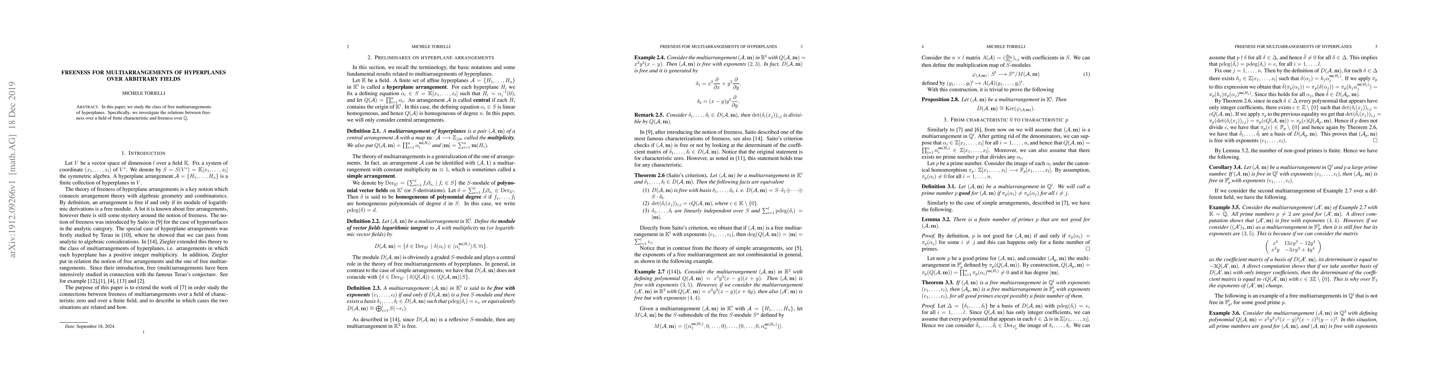 Summary: This paper explores free multiarrangements of hyperplanes, focusing on the relationship between their freeness over fields of finite characteristic and rationals. The study aims to understand how these properties interact across different fields.