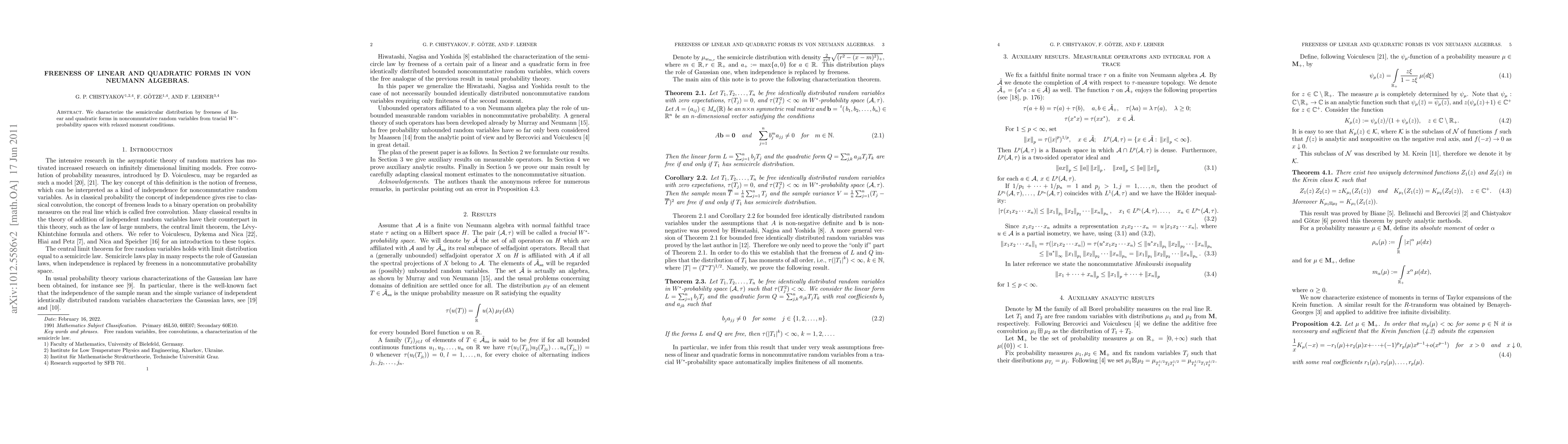 We characterize semicircular distribution by the freeness of linear and quadratic forms in noncommutative random variables from a tracial $W^*$-probability space with relaxed moment conditions.