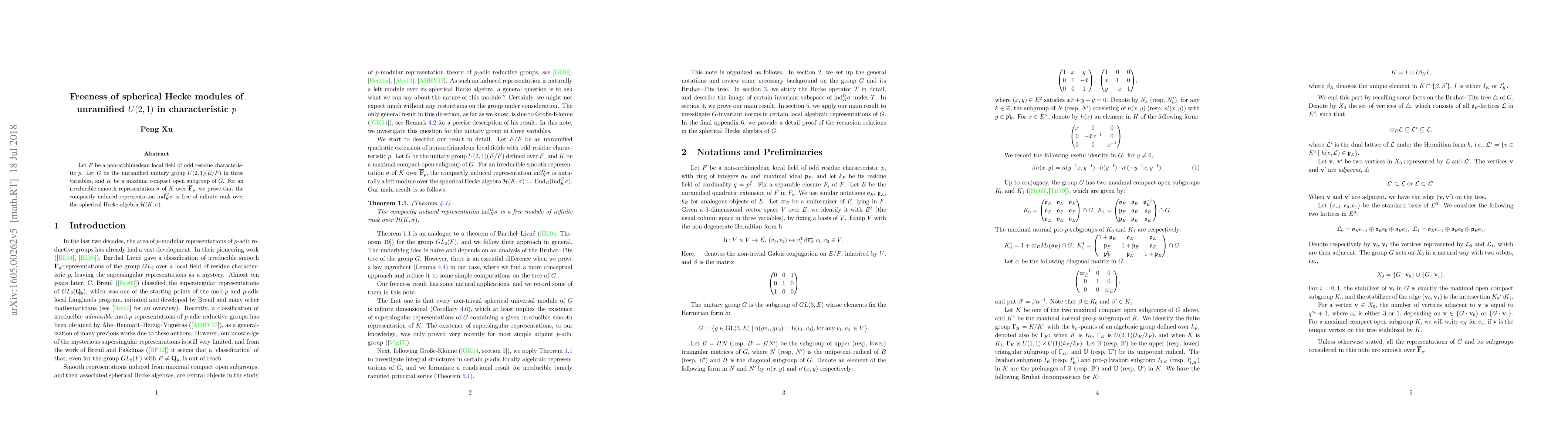 The paper proves that compactly induced representations of the unramified unitary group U(2,1) in characteristic p are free of infinite rank over the spherical Hecke algebra.