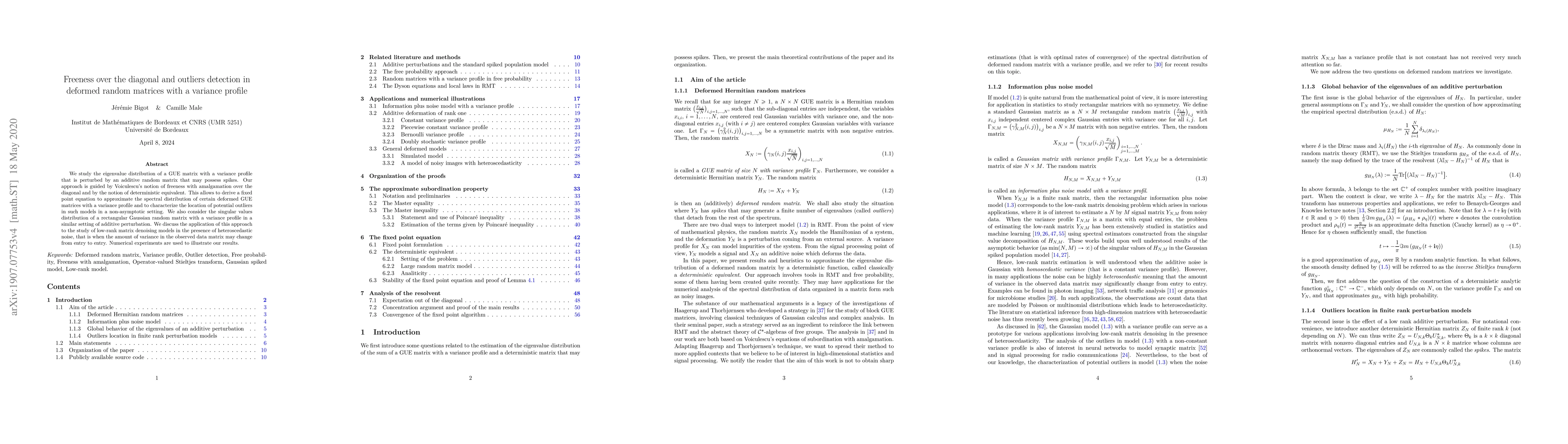 This paper studies eigenvalue distribution of deformed GUE matrices with a variance profile under additive random matrix perturbations, focusing on freeness over the diagonal and outliers detection in non-asymptotic settings.