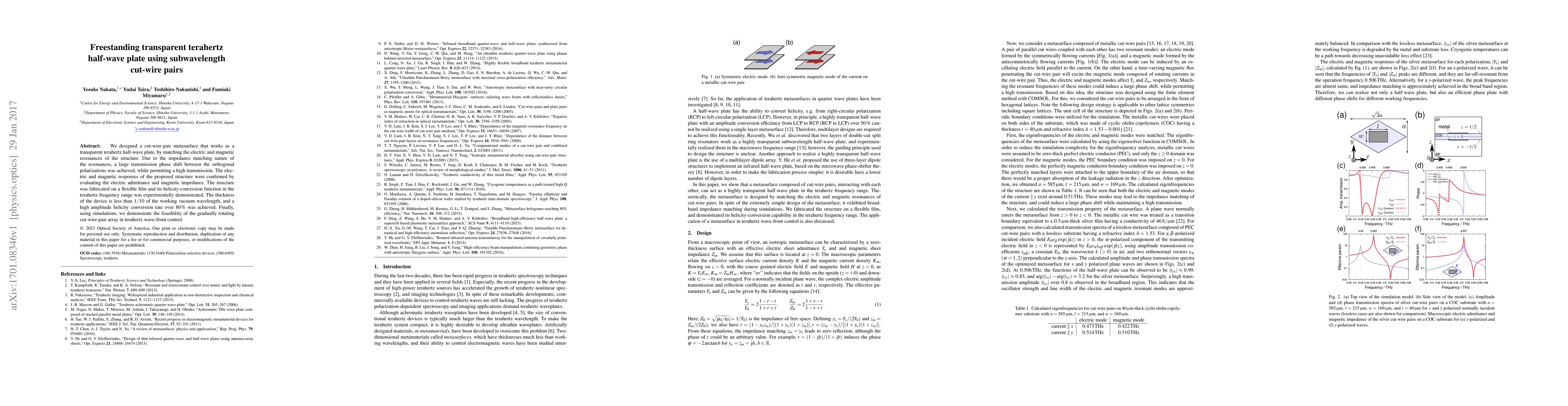 We designed a cut-wire-pair metasurface that works as a transparent terahertz half-wave plate, by matching the electric and magnetic resonances of the structure. Due to the impedance matching nature of the resonances, a large transmission phase shift between the orthogonal polarizations was achieved, while permitting a high transmission. The electric and magnetic responses of the proposed structure were confirmed by evaluating the electric admittance and magnetic impedance. The structure was fabricated on a flexible film and its helicity-conversion function in the terahertz frequency range was experimentally demonstrated. The thickness of the device is less than 1/10 of the working vacuum wavelength, and a high amplitude helicity conversion rate over 80% was achieved. Finally, using simulations, we demonstrate the feasibility of the gradually rotating cut-wire-pair array in terahertz wave-front control.
