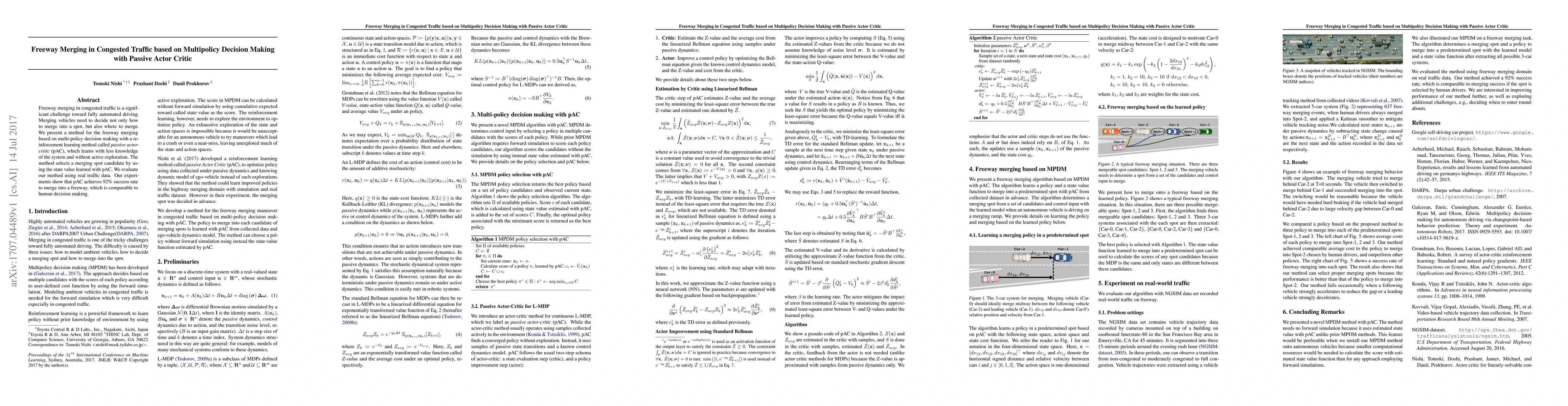 This paper proposes a method for automated freeway merging in congested traffic using a reinforcement learning technique called passive actor-critic (pAC). The pAC method achieves a 92% success rate in merging, comparable to human decision making, by selecting merging spot candidates based on learned state values.