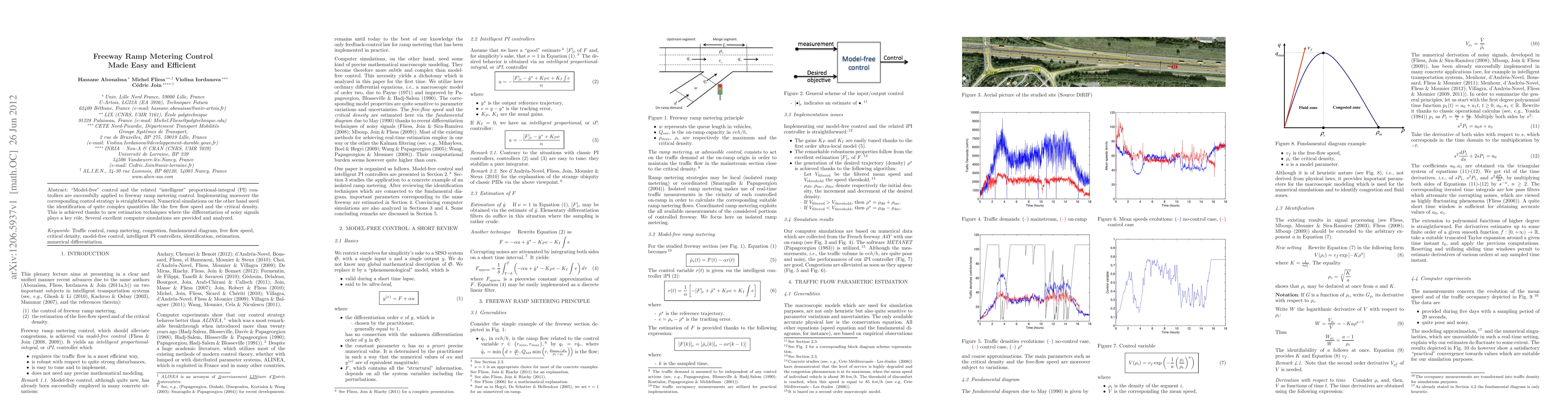 "Model-free" control and the related "intelligent" proportional-integral (PI) controllers are successfully applied to freeway ramp metering control. Implementing moreover the corresponding control strategy is straightforward. Numerical simulations on the other hand need the identification of quite complex quantities like the free flow sp\^eed and the critical density. This is achieved thanks to new estimation techniques where the differentiation of noisy signals plays a key r\^ole. Several excellent computer simulations are provided and analyzed.