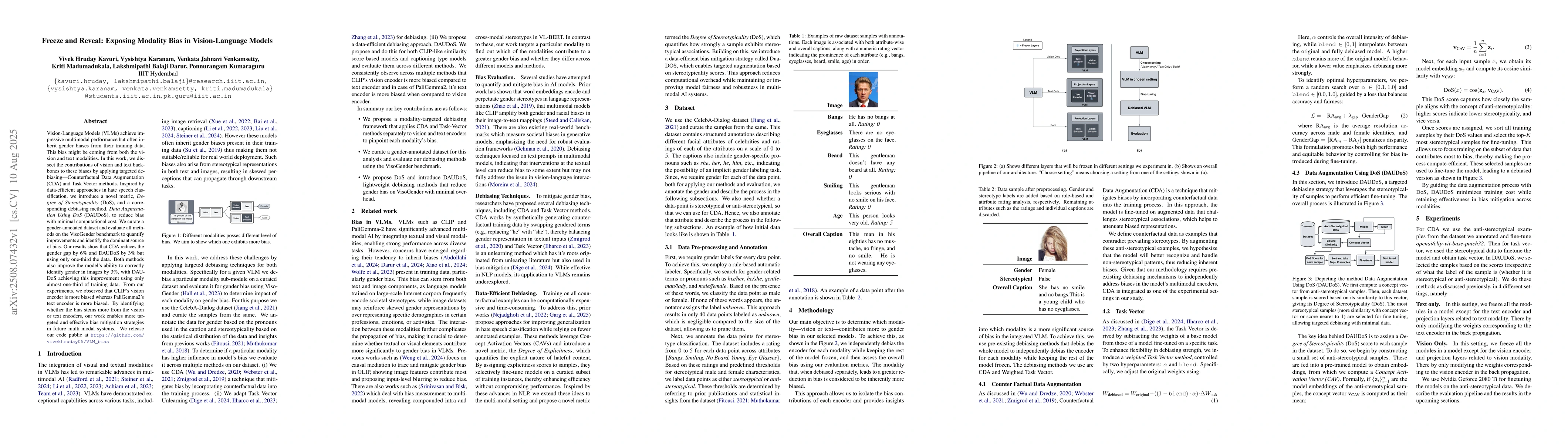 Vision Language Models achieve impressive multi-modal performance but often inherit gender biases from their training data. This bias might be coming from both the vision and text modalities. In this work, we dissect the contributions of vision and text backbones to these biases by applying targeted debiasing using Counterfactual Data Augmentation and Task Vector methods. Inspired by data-efficient approaches in hate-speech classification, we introduce a novel metric, Degree of Stereotypicality and a corresponding debiasing method, Data Augmentation Using Degree of Stereotypicality - DAUDoS, to reduce bias with minimal computational cost. We curate a gender annotated dataset and evaluate all methods on VisoGender benchmark to quantify improvements and identify dominant source of bias. Our results show that CDA reduces the gender gap by 6% and DAUDoS by 3% but using only one-third of the data. Both methods also improve the model's ability to correctly identify gender in images by 3%, with DAUDoS achieving this improvement using only almost one-third of training data. From our experiment's, we observed that CLIP's vision encoder is more biased whereas PaliGemma2's text encoder is more biased. By identifying whether bias stems more from vision or text encoders, our work enables more targeted and effective bias mitigation strategies in future multi-modal systems.