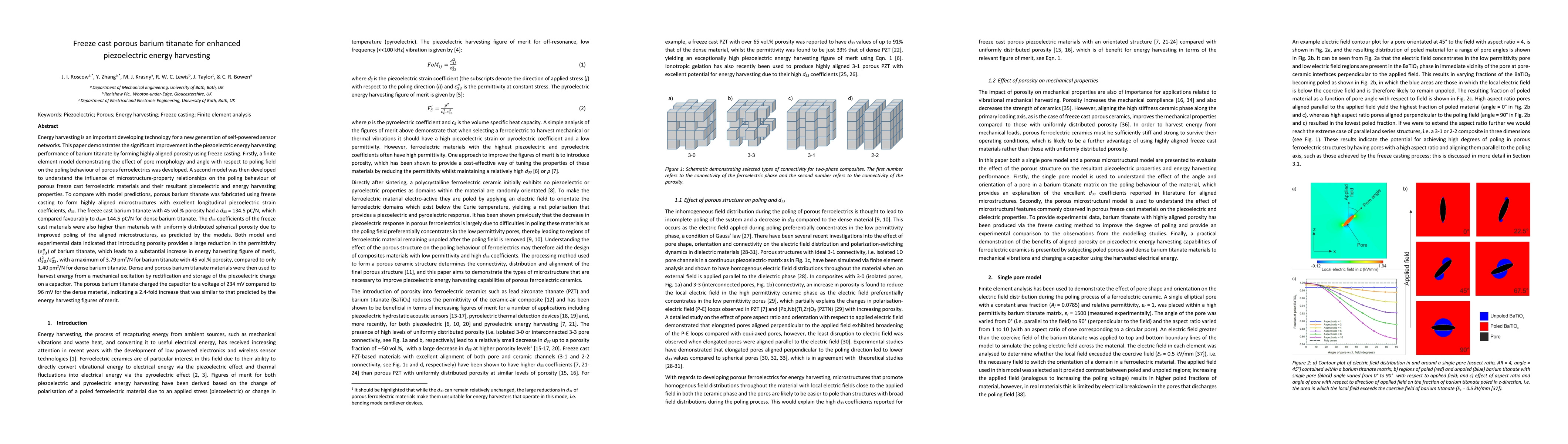 Energy harvesting is an important developing technology for a new generation of self-powered sensor networks. This paper demonstrates the significant improvement in the piezoelectric energy harvesting performance of barium titanate by forming highly aligned porosity using freeze casting. Firstly, a finite element model demonstrating the effect of pore morphology and angle with respect to poling field on the poling behaviour of porous ferroelectrics was developed. A second model was then developed to understand the influence of microstructure-property relationships on the poling behaviour of porous freeze cast ferroelectric materials and their resultant piezoelectric and energy harvesting properties. To compare with model predictions, porous barium titanate was fabricated using freeze casting to form highly aligned microstructures with excellent longitudinal piezoelectric strain coefficients, d 33. Both model and experimental data indicated that introducing porosity provides a large reduction in the permittivity () of barium titanate, which leads to a substantial increase in energy harvesting figure of merit, , with a maximum of 3.79 pm2 N-1 for barium titanate with 45 vol.% porosity, compared to only 1.40 pm2 N-1 for dense barium titanate. Dense and porous barium titanate materials were then used to harvest energy from a mechanical excitation by rectification and storage of the piezoelectric charge on a capacitor. The porous barium titanate charged the capacitor to a voltage of 234 mV compared to 96 mV for the dense material, indicating a 2.4-fold increase that was similar to that predicted by the energy harvesting figures of merit.