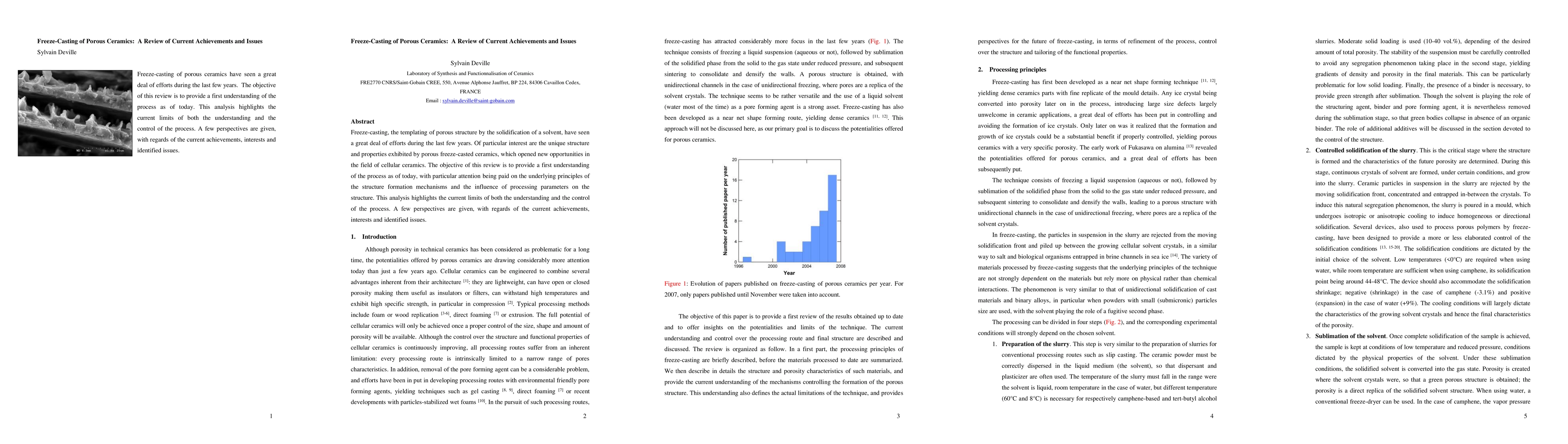 This review examines the freeze-casting process for creating porous ceramics, highlighting the unique structures and properties it produces. It focuses on the mechanisms of structure formation and the impact of processing parameters, while also identifying current limitations and future research directions.
