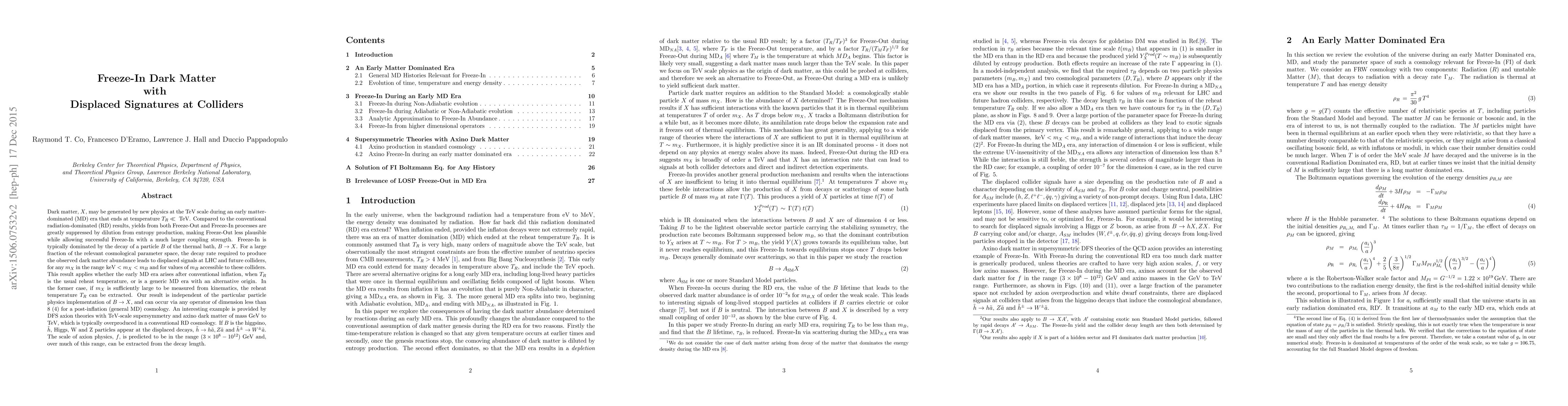 Dark matter, $X$, may be generated by new physics at the TeV scale during an early matter-dominated (MD) era that ends at temperature $T_R \ll {\rm TeV}$. Compared to the conventional radiation-dominated (RD) results, yields from both Freeze-Out and Freeze-In processes are greatly suppressed by dilution from entropy production, making Freeze-Out less plausible while allowing successful Freeze-In with a much larger coupling strength. Freeze-In is typically dominated by the decay of a particle $B$ of the thermal bath, $B \rightarrow X$. For a large fraction of the relevant cosmological parameter space, the decay rate required to produce the observed dark matter abundance leads to displaced signals at LHC and future colliders, for any $m_X$ in the range ${\rm keV} < m_X < m_B$ and for values of $m_B$ accessible to these colliders. This result applies whether the early MD era arises after conventional inflation, when $T_R$ is the usual reheat temperature, or is a generic MD era with an alternative origin. In the former case, if $m_X$ is sufficiently large to be measured from kinematics, the reheat temperature $T_R$ can be extracted. Our result is independent of the particular particle physics implementation of $B \rightarrow X$, and can occur via any operator of dimension less than 8 (4) for a post-inflation (general MD) cosmology. An interesting example is provided by DFS axion theories with TeV-scale supersymmetry and axino dark matter of mass GeV to TeV, which is typically overproduced in a conventional RD cosmology. If $B$ is the higgsino, $\tilde h$, Higgs, W and Z particles appear at the displaced decays, $\tilde h \rightarrow h \tilde a, Z \tilde a$ and $\tilde h^\pm \rightarrow W^\pm \tilde a$. The scale of axion physics, $f$, is predicted to be in the range $(3\times10^8 - 10^{12})$ GeV and, over much of this range, can be extracted from the decay length.