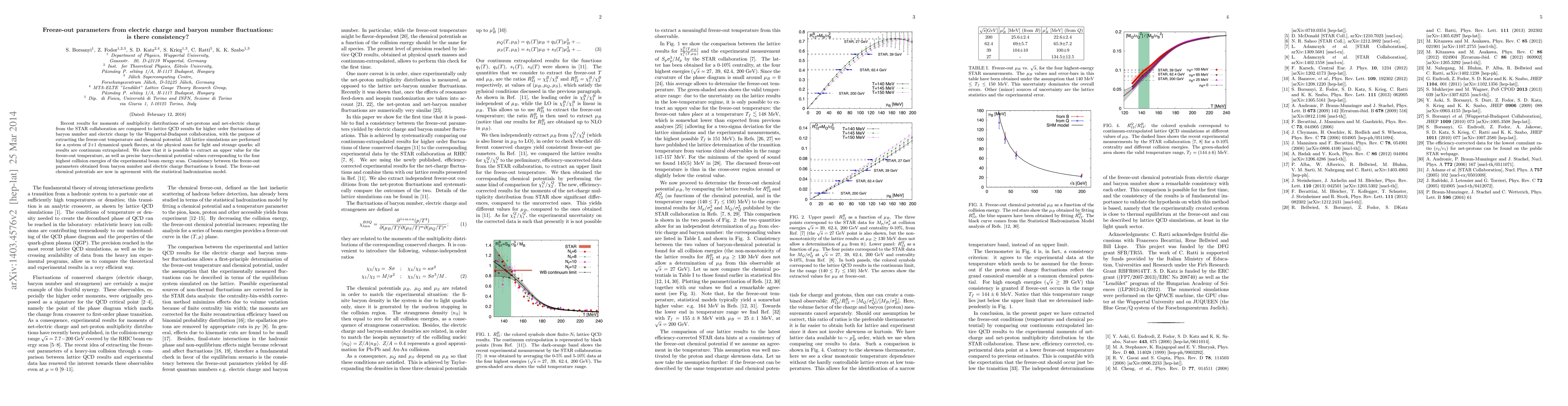 This paper compares experimental results from the STAR collaboration on net-proton and net-electric charge fluctuations with lattice QCD results from the Wuppertal-Budapest collaboration to determine freeze-out parameters. It finds consistency in the extracted freeze-out temperature and chemical potential values, aligning with the statistical hadronization model.