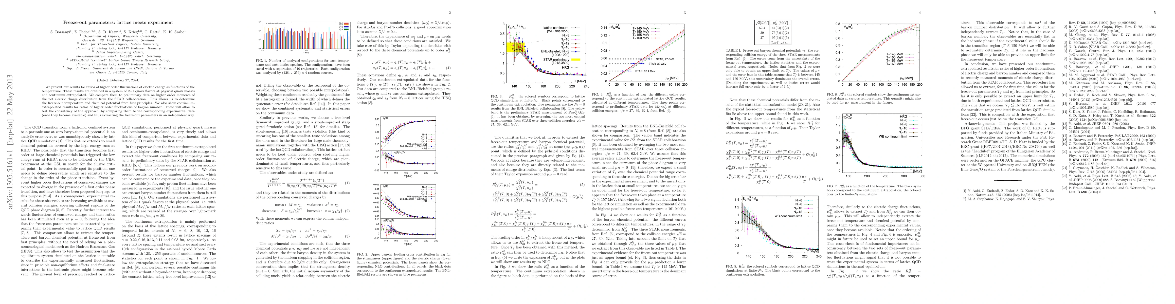 We present our results for ratios of higher order fluctuations of electric charge as functions of the temperature. These results are obtained in a system of 2+1 quark flavors at physical quark masses and continuum extrapolated. We compare them to preliminary data on higher order moments of the net electric charge distribution from the STAR collaboration. This allows us to determine the freeze-out temperature and chemical potential from first principles. We also show continuum-extrapolated results for ratios of higher order fluctuations of baryon number. These will allow to test the consistency of the approach, by comparing them to the corresponding experimental data (once they become available) and thus extracting the freeze-out parameters in an independent way.