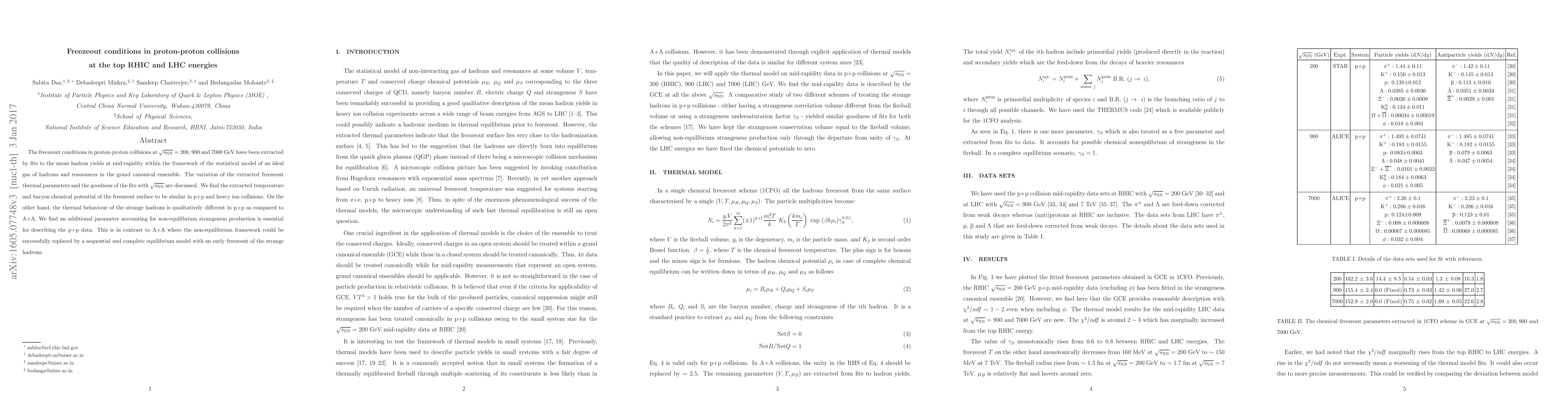 The freezeout conditions in proton-proton collisions at $\sqrt{s_{\textrm{NN}}}= 200$, $900$ and $7000$ GeV have been extracted by fits to the mean hadron yields at mid-rapidity within the framework of the statistical model of an ideal gas of hadrons and resonances in the grand canonical ensemble. The variation of the extracted freezeout thermal parameters and the goodness of the fits with $\sqrt{s_{\textrm{NN}}}$ are discussed. We find the extracted temperature and baryon chemical potential of the freezeout surface to be similar in p+p and heavy ion collisions. On the other hand, the thermal behaviour of the strange hadrons is qualitatively different in p+p as compared to A+A. We find an additional parameter accounting for non-equilibrium strangeness production is essential for describing the p+p data. This is in contrast to A+A where the non-equilibrium framework could be successfully replaced by a sequential and complete equilibrium model with an early freezeout of the strange hadrons.