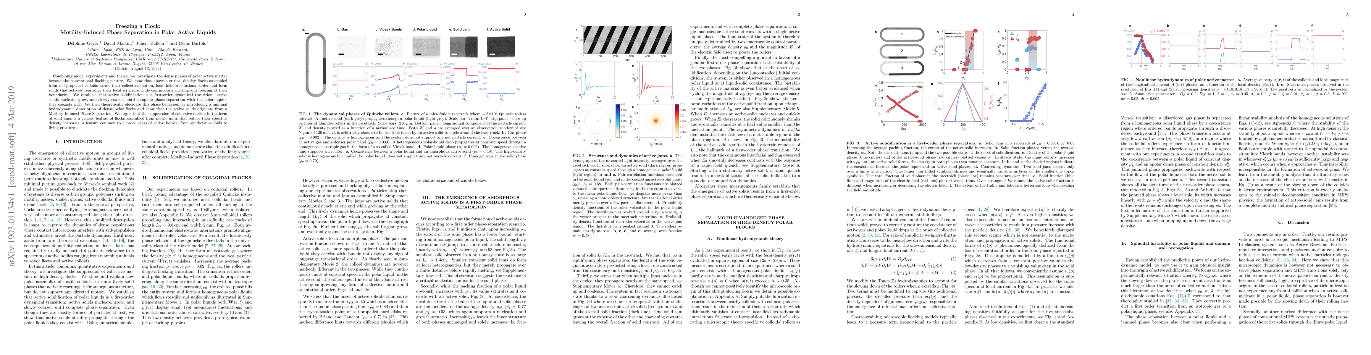This research investigates the behavior of dense polar active matter, demonstrating that flocks of self-propelled colloids arrest collective motion and form active solids at high densities. The study shows that this transition is a first-order dynamical phase separation, driven by Motility-Induced Phase Separation, and is a generic feature for various motile units.