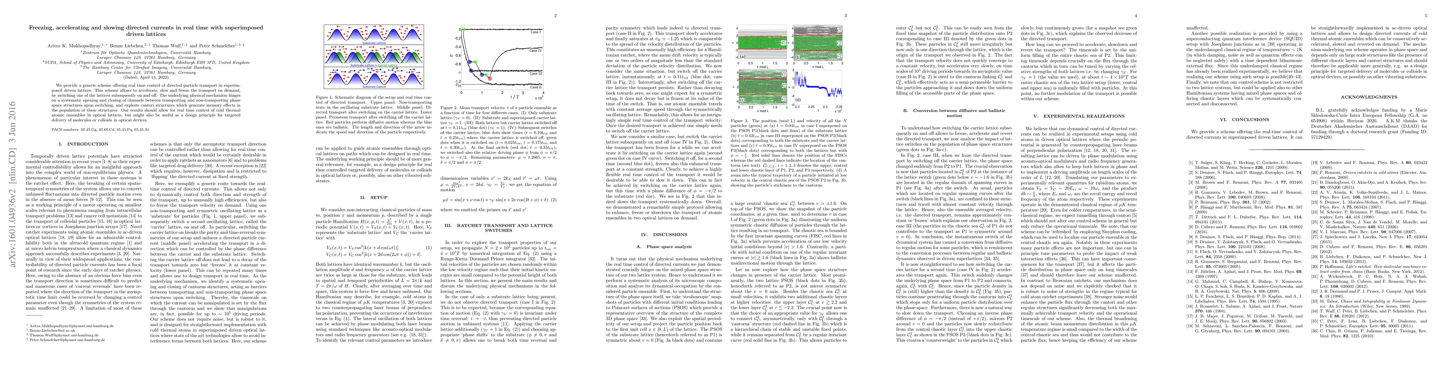 This paper proposes a method for real-time control of directed particle transport in driven lattices by switching lattices on and off, enabling acceleration, slowing, and freezing of transport. The technique leverages the opening and closing of channels between phase space structures and cantori-induced memory effects.