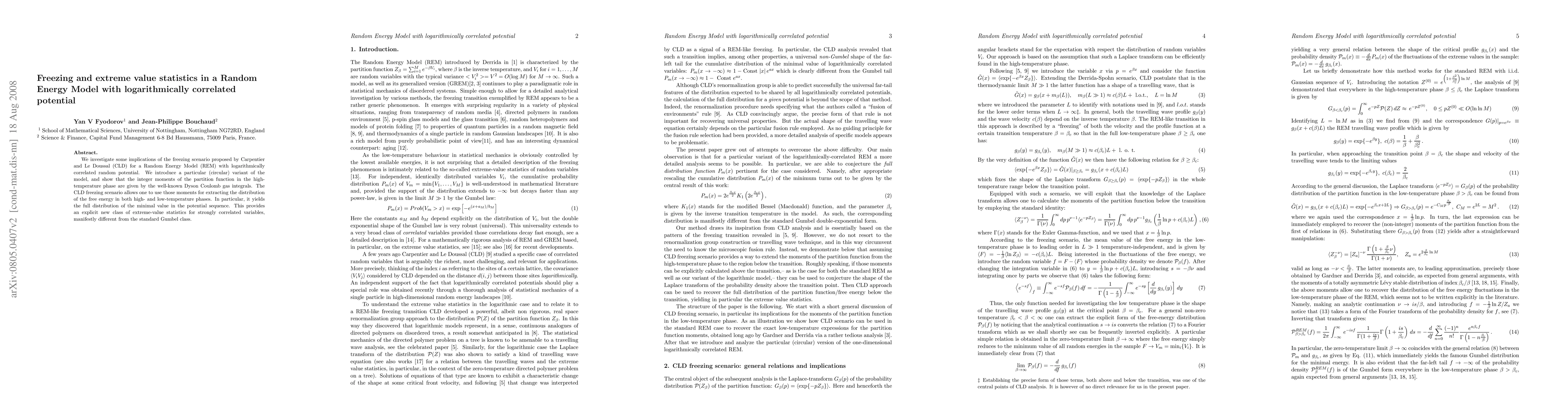 This paper explores the freezing scenario in a Random Energy Model with logarithmically correlated potential, introducing a circular variant. It demonstrates that the integer moments of the partition function correspond to Dyson Coulomb gas integrals, enabling the extraction of free energy distributions and revealing a new class of extreme-value statistics distinct from the Gumbel class.
