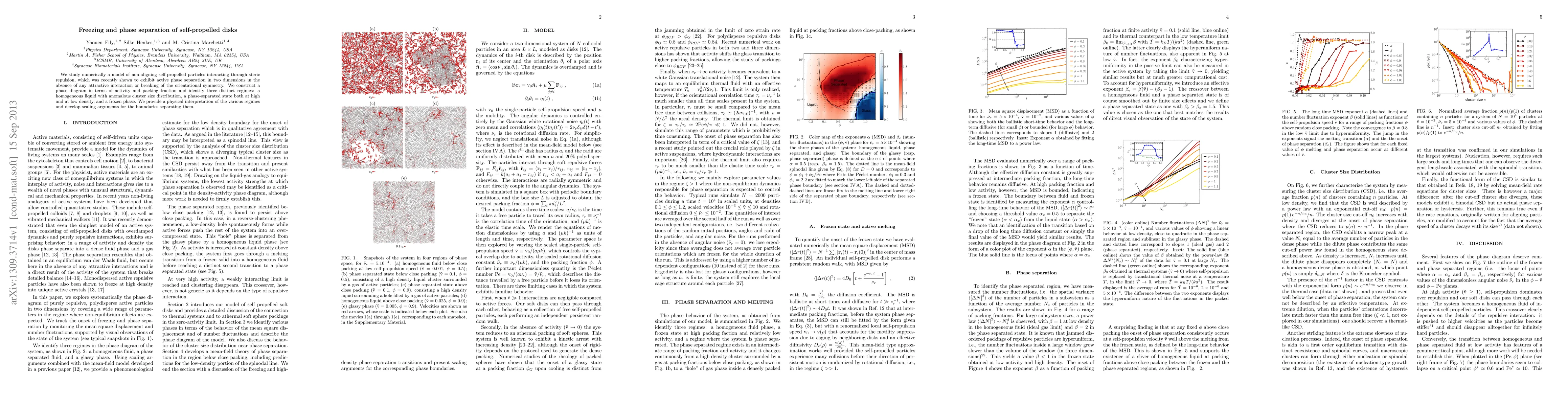 This paper numerically investigates a model of self-propelled disks that repel each other, revealing three distinct phases: a homogeneous liquid, a phase-separated state at both high and low densities, and a frozen phase, based on activity and packing fraction. The study provides a physical interpretation and scaling arguments for the phase boundaries.