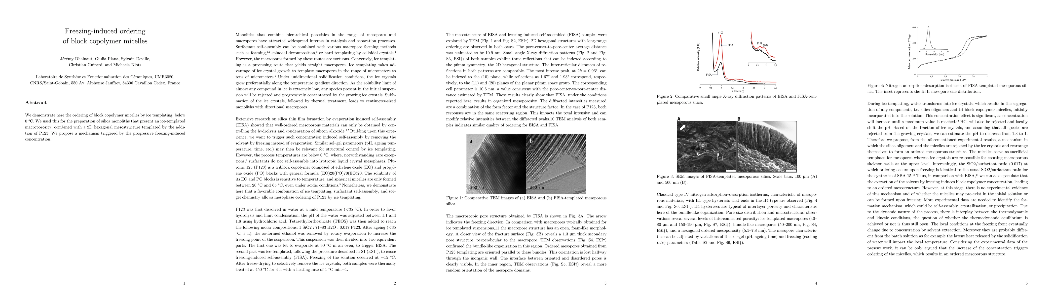 This study shows how block copolymer micelles can be ordered using ice templating below 0°C, leading to silica monoliths with ice-templated macroporosity and a 2D hexagonal mesostructure, facilitated by the concentration changes during freezing.