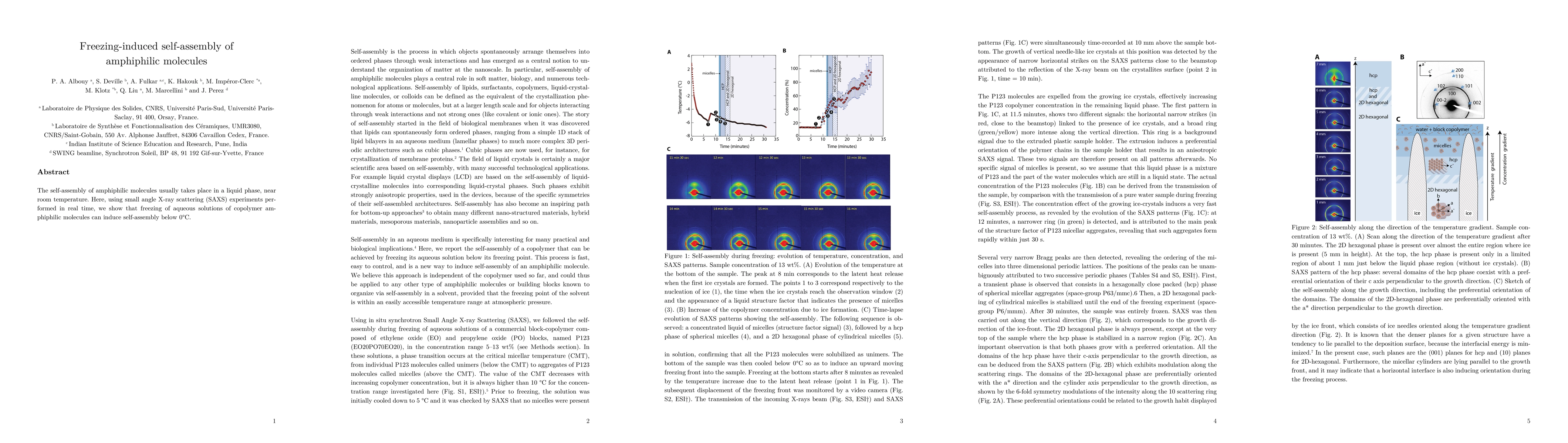 This paper demonstrates that freezing aqueous solutions of copolymer amphiphilic molecules can induce self-assembly below 0°C, a process typically occurring near room temperature, as shown through real-time small angle X-ray scattering experiments.