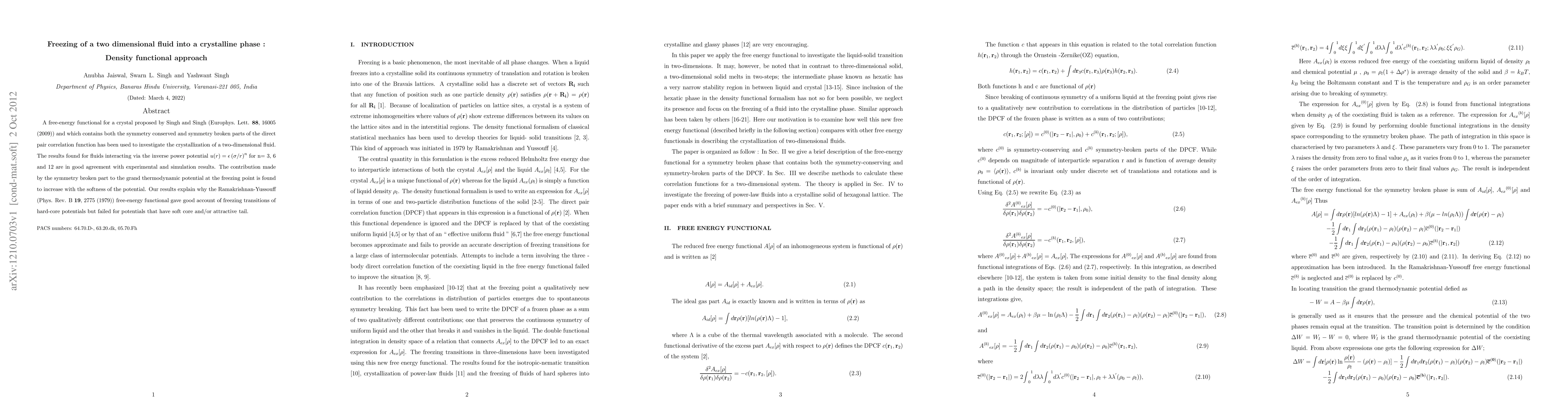 This paper uses a density functional approach to study the crystallization of two-dimensional fluids, showing good agreement with experimental and simulation results for fluids with inverse power potentials. The symmetry broken part's contribution to the grand thermodynamic potential increases with potential softness, explaining the functional's success with hard-core but failure with soft-core potentials.