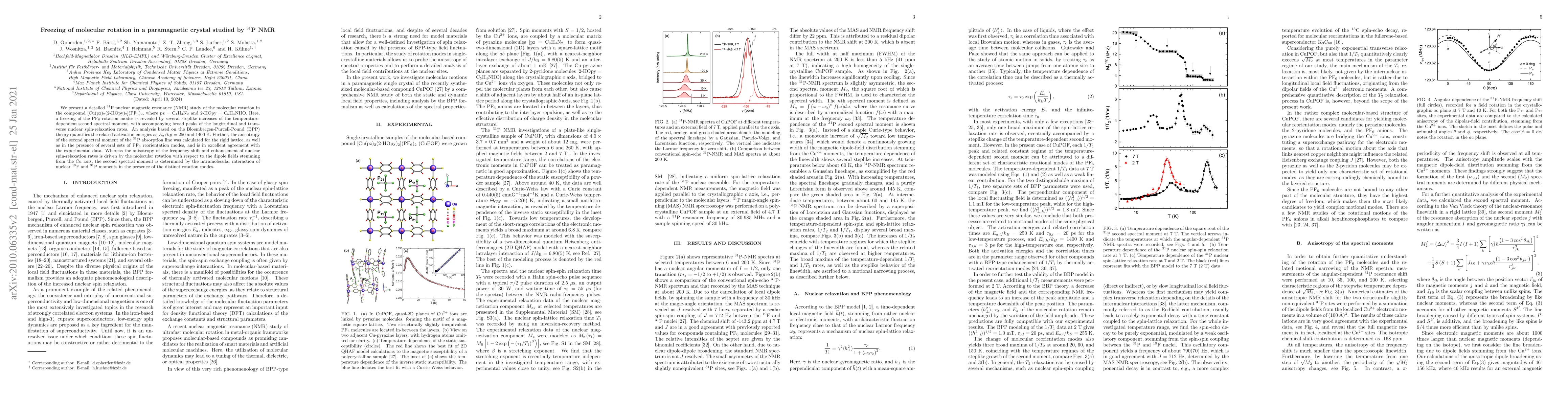 We present a detailed $^{31}$P nuclear magnetic resonance (NMR) study of the molecular rotation in the compound [Cu(pz)$_{2}$(2-HOpy)$_{2}$](PF$_{6}$)$_{2}$, where pz = C$_4$H$_4$N$_2$ and 2-HOpy = C$_5$H$_4$NHO. Here, a freezing of the PF$_6$ rotation modes is revealed by several steplike increases of the temperature-dependent second spectral moment, with accompanying broad peaks of the longitudinal and transverse nuclear spin-relaxation rates. An analysis based on the Bloembergen-Purcell-Pound (BPP) theory quantifies the related activation energies as $E_{a}/k_{B}$ = 250 and 1400 K. Further, the anisotropy of the second spectral moment of the $^{31}$P absorption line was calculated for the rigid lattice, as well as in the presence of several sets of PF$_6$ reorientation modes, and is in excellent agreement with the experimental data. Whereas the anisotropy of the frequency shift and enhancement of nuclear spin-relaxation rates is driven by the molecular rotation with respect to the dipole fields stemming from the Cu ions, the second spectral moment is determined by the intramolecular interaction of nuclear $^{19}$F and $^{31}$P moments in the presence of the distinct rotation modes.