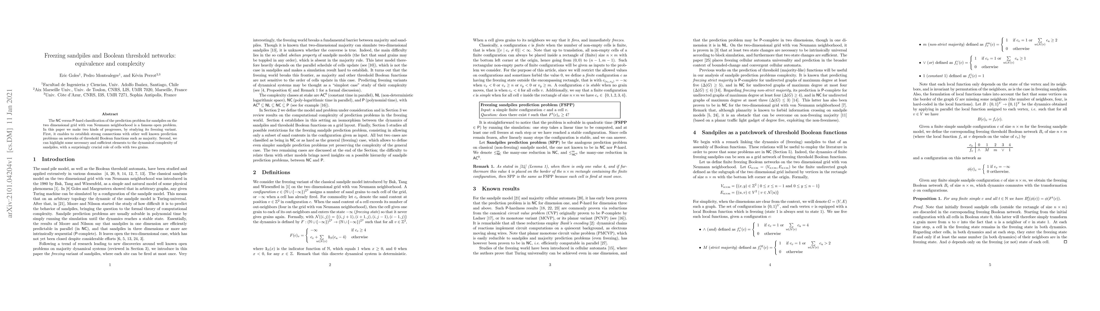 The NC versus P-hard classification of the prediction problem for sandpiles on the two dimensional grid with von Neumann neighborhood is a famous open problem. In this paper we make two kinds of progresses, by studying its freezing variant. First, it enables to establish strong connections with other well known prediction problems on networks of threshold Boolean functions such as majority. Second, we can highlight some necessary and sufficient elements to the dynamical complexity of sandpiles, with a surprisingly crucial role of cells with two grains.