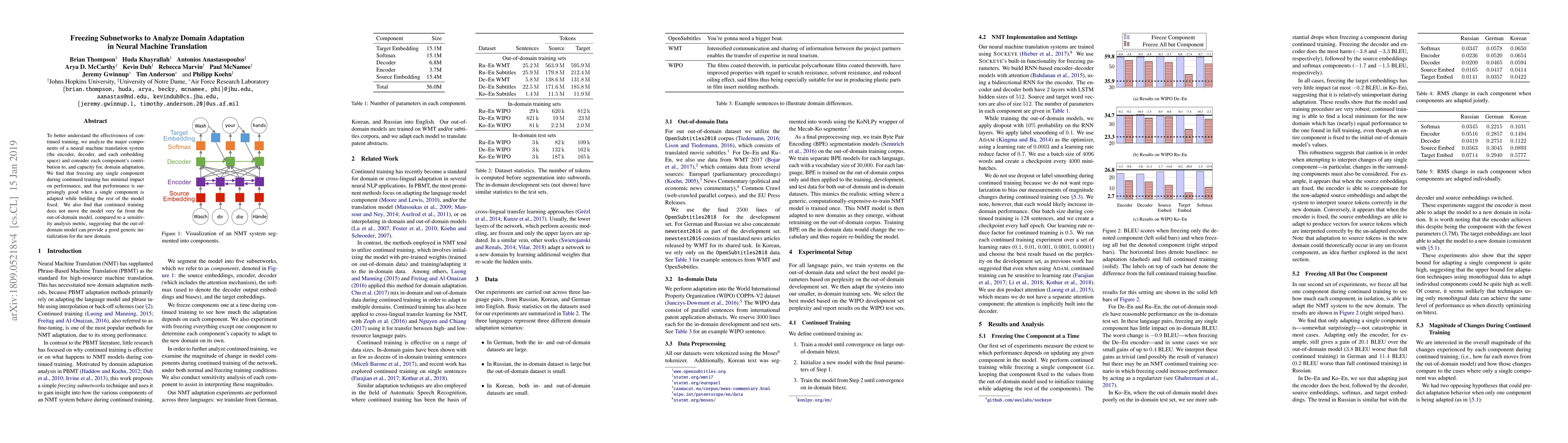 To better understand the effectiveness of continued training, we analyze the major components of a neural machine translation system (the encoder, decoder, and each embedding space) and consider each component's contribution to, and capacity for, domain adaptation. We find that freezing any single component during continued training has minimal impact on performance, and that performance is surprisingly good when a single component is adapted while holding the rest of the model fixed. We also find that continued training does not move the model very far from the out-of-domain model, compared to a sensitivity analysis metric, suggesting that the out-of-domain model can provide a good generic initialization for the new domain.