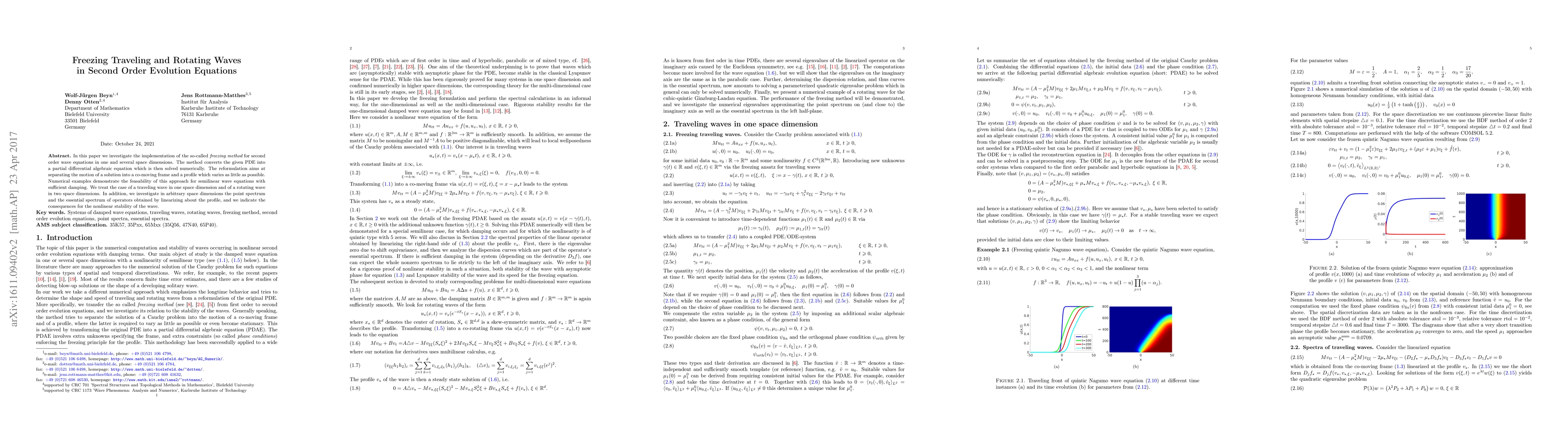 This paper explores the freezing method for solving second order wave equations, transforming them into partial differential algebraic equations to numerically separate solution motion into a co-moving frame and a minimal-variation profile. It demonstrates the method's effectiveness for semilinear wave equations and examines traveling and rotating wave cases, also analyzing the point and essential spectra for nonlinear stability.