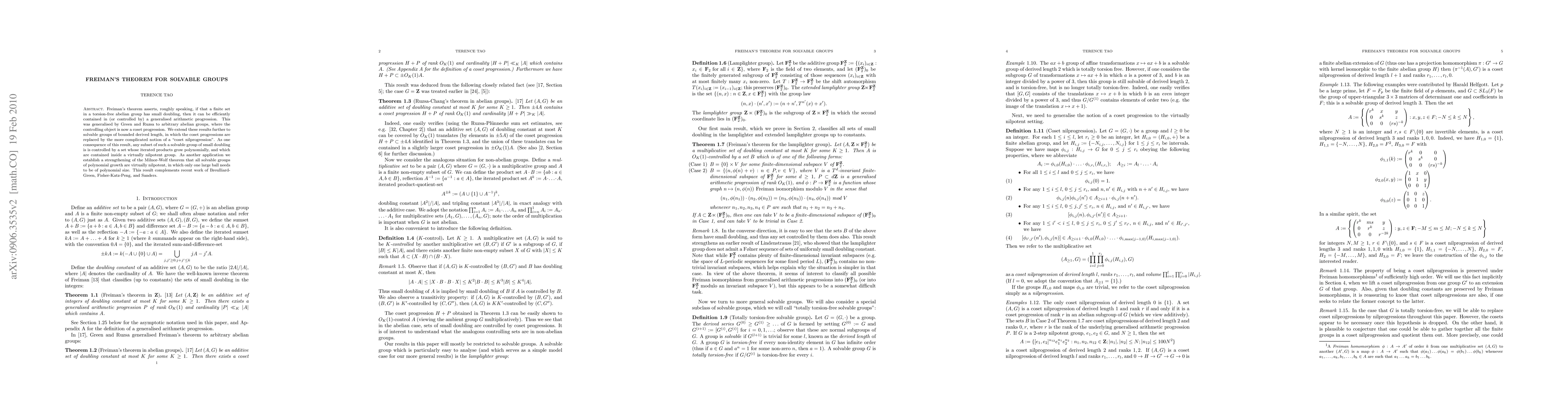 The paper extends Freiman's theorem to solvable groups of bounded derived length, showing that subsets with small doubling can be controlled within a virtually nilpotent group, and establishes a strengthening of the Milnor-Wolf theorem for such groups.