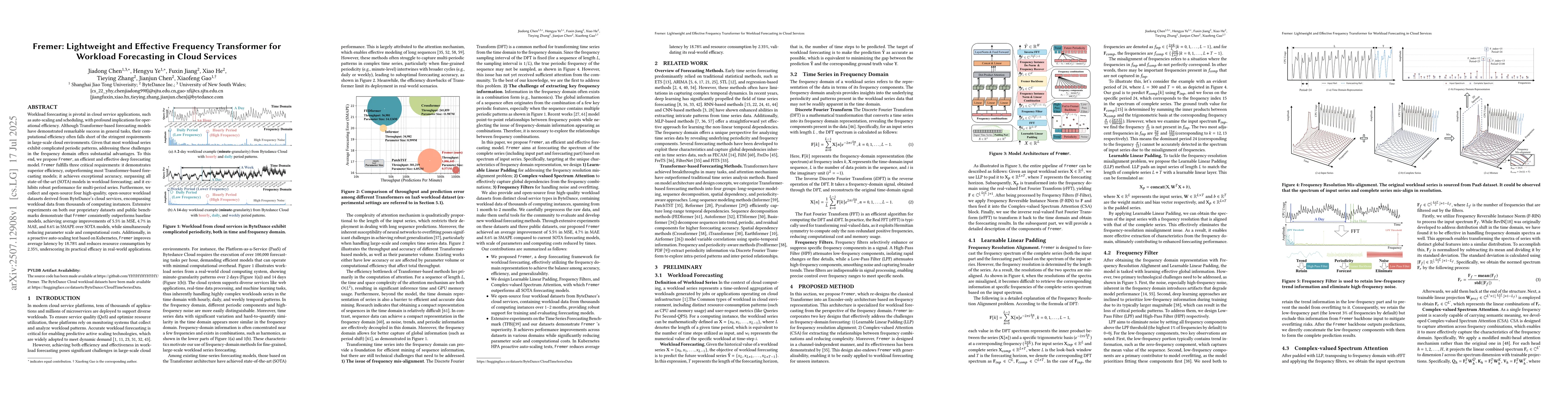 Workload forecasting is pivotal in cloud service applications, such as auto-scaling and scheduling, with profound implications for operational efficiency. Although Transformer-based forecasting models have demonstrated remarkable success in general tasks, their computational efficiency often falls short of the stringent requirements in large-scale cloud environments. Given that most workload series exhibit complicated periodic patterns, addressing these challenges in the frequency domain offers substantial advantages. To this end, we propose Fremer, an efficient and effective deep forecasting model. Fremer fulfills three critical requirements: it demonstrates superior efficiency, outperforming most Transformer-based forecasting models; it achieves exceptional accuracy, surpassing all state-of-the-art (SOTA) models in workload forecasting; and it exhibits robust performance for multi-period series. Furthermore, we collect and open-source four high-quality, open-source workload datasets derived from ByteDance's cloud services, encompassing workload data from thousands of computing instances. Extensive experiments on both our proprietary datasets and public benchmarks demonstrate that Fremer consistently outperforms baseline models, achieving average improvements of 5.5% in MSE, 4.7% in MAE, and 8.6% in SMAPE over SOTA models, while simultaneously reducing parameter scale and computational costs. Additionally, in a proactive auto-scaling test based on Kubernetes, Fremer improves average latency by 18.78% and reduces resource consumption by 2.35%, underscoring its practical efficacy in real-world applications.