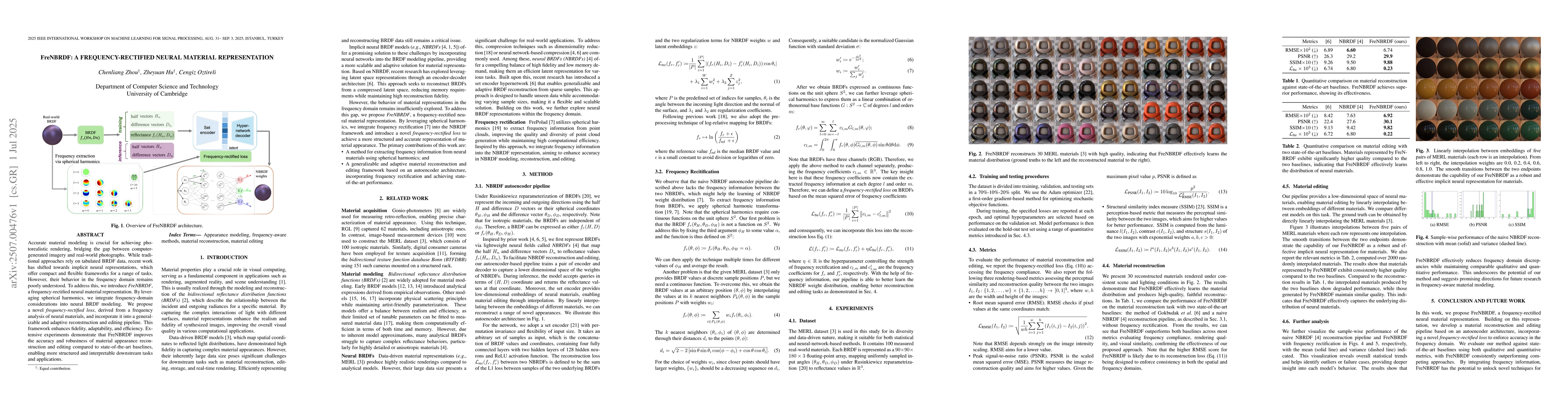 Accurate material modeling is crucial for achieving photorealistic rendering, bridging the gap between computer-generated imagery and real-world photographs. While traditional approaches rely on tabulated BRDF data, recent work has shifted towards implicit neural representations, which offer compact and flexible frameworks for a range of tasks. However, their behavior in the frequency domain remains poorly understood. To address this, we introduce FreNBRDF, a frequency-rectified neural material representation. By leveraging spherical harmonics, we integrate frequency-domain considerations into neural BRDF modeling. We propose a novel frequency-rectified loss, derived from a frequency analysis of neural materials, and incorporate it into a generalizable and adaptive reconstruction and editing pipeline. This framework enhances fidelity, adaptability, and efficiency. Extensive experiments demonstrate that \ours improves the accuracy and robustness of material appearance reconstruction and editing compared to state-of-the-art baselines, enabling more structured and interpretable downstream tasks and applications.