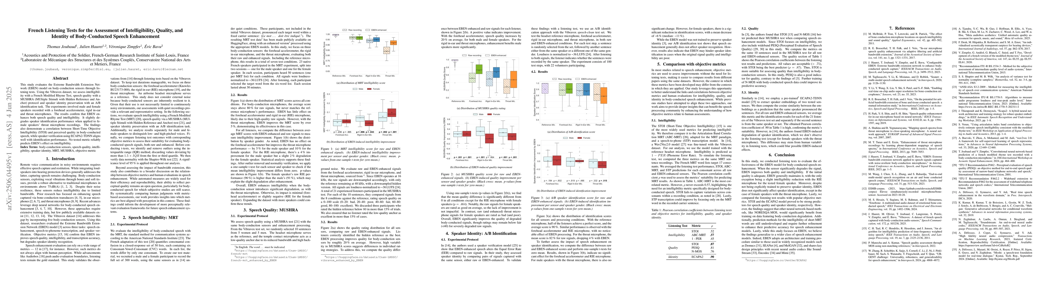 A study evaluates the Extreme Bandwidth Extension Network (EBEN) model for body-conduction sensors using French listening tests, confirming its improvement in speech quality and intelligibility, while slightly degrading speaker identification performance.