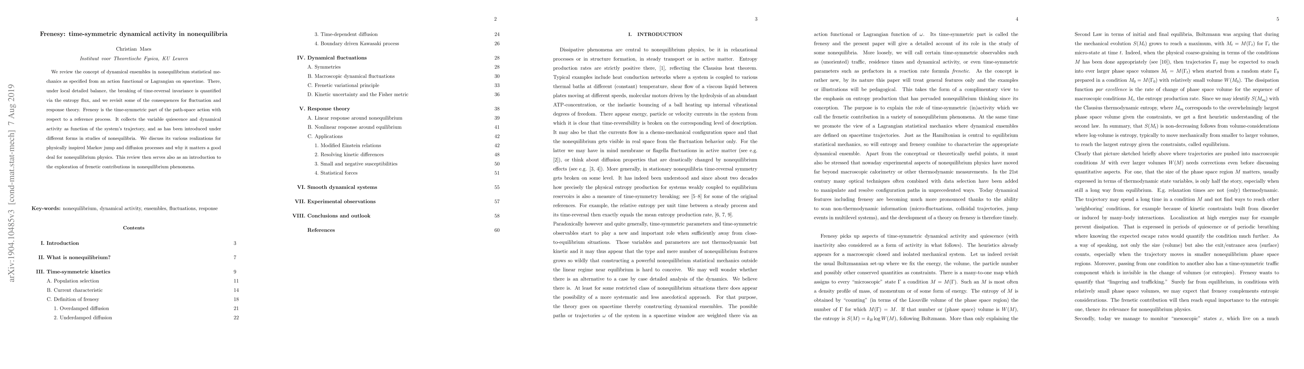 We review the concept of dynamical ensembles in nonequilibrium statistical mechanics as specified from an action functional or Lagrangian on spacetime. There, under local detailed balance, the breaking of time-reversal invariance is quantified via the entropy flux, and we revisit some of the consequences for fluctuation and response theory. Frenesy is the time-symmetric part of the path-space action with respect to a reference process. It collects the variable quiescence and dynamical activity as function of the system's trajectory, and as has been introduced under different forms in studies of nonequilibria. We discuss its various realizations for physically inspired Markov jump and diffusion processes and why it matters a good deal for nonequilibrium physics. This review then serves also as an introduction to the exploration of frenetic contributions in nonequilibrium phenomena.