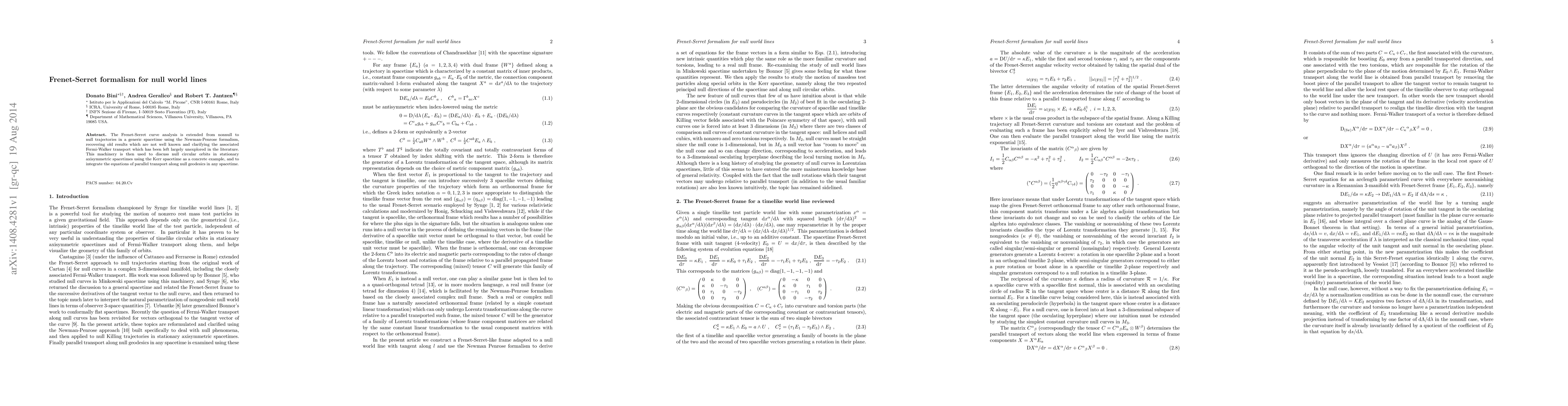 The paper introduces a comprehensive Frenet-Serret formalism for null world lines, extending previous work to provide a clearer understanding of Fermi-Walker transport and its application to null circular orbits in stationary axisymmetric spacetimes.