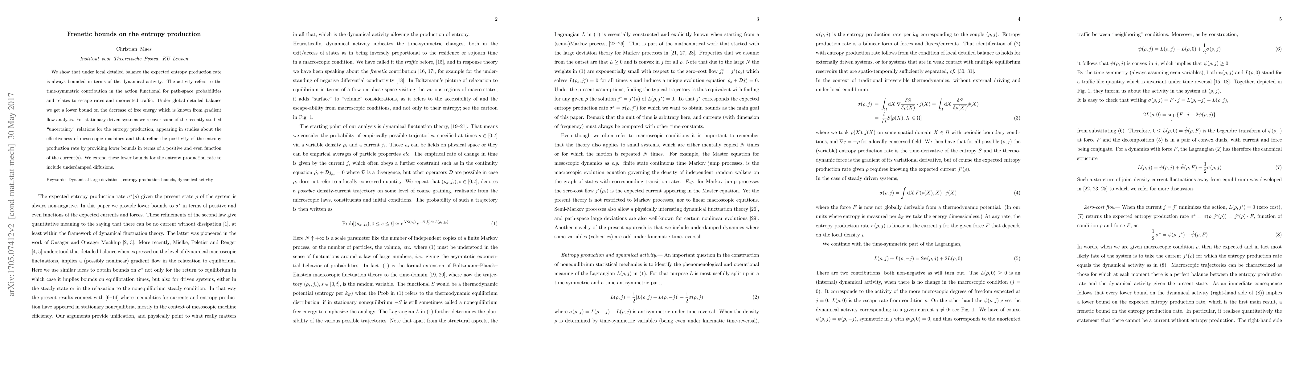 We show that under local detailed balance the expected entropy production rate is always bounded in terms of the dynamical activity. The activity refers to the time-symmetric contribution in the action functional for path-space probabilities and relates to escape rates and unoriented traffic. Under global detailed balance we get a lower bound on the decrease of free energy which is known from gradient flow analysis. For stationary driven systems we recover some of the recently studied "uncertainty" relations for the entropy production, appearing in studies about the effectiveness of mesoscopic machines and that refine the positivity of the entropy production rate by providing lower bounds in terms of a positive and even function of the current(s). We extend these lower bounds for the entropy production rate to include underdamped diffusions.
